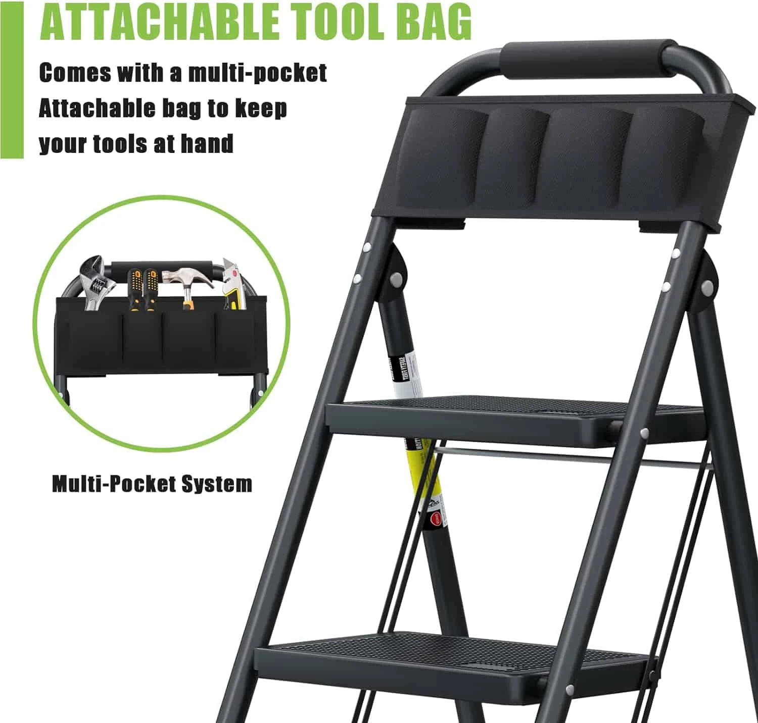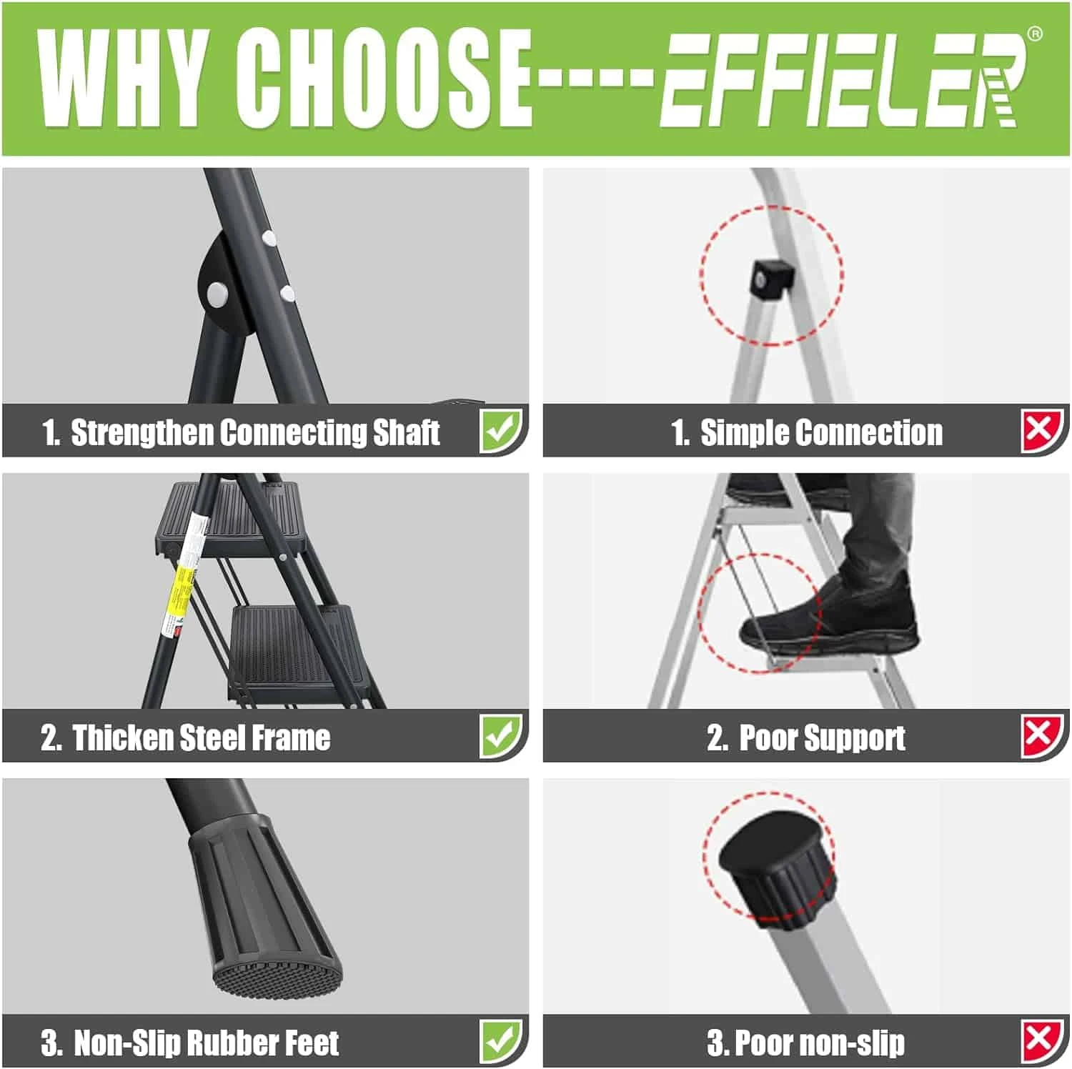 - NEW DESIGN LOCK-FREE SUPPORT FRAME:The support rod design of the EFFIELER 3-step ladder is 25% higher than the carrying capacity of the ordinary 3-step stool,The bracket and the main body are tightly connected, stable and without shaking,The folding ladder can be easily folded during storage, which is very convenient