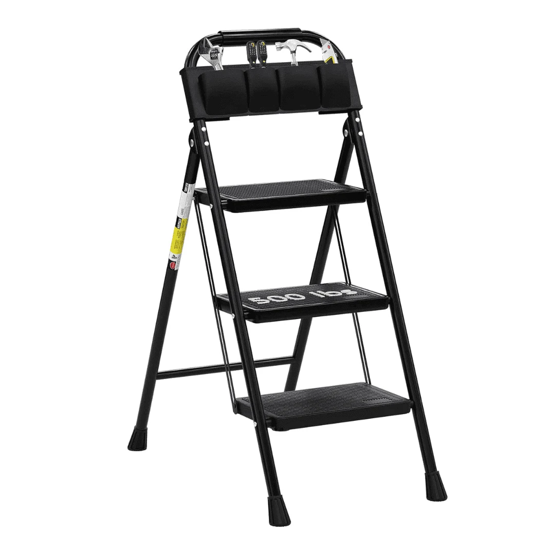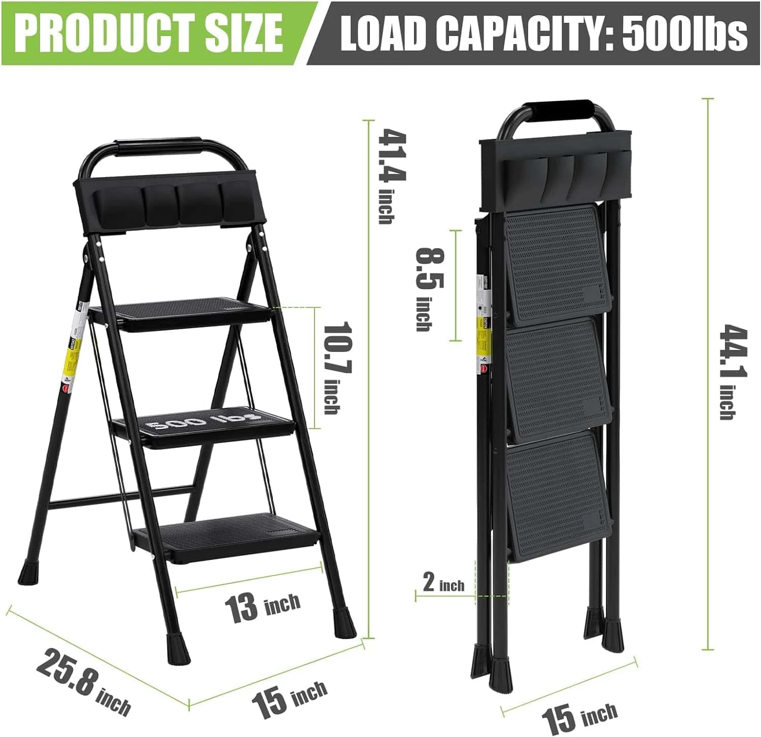 3 Step Ladder EFFIELER Folding Step Stool with Wide Anti-Slip Pedal, 500 lbs Sturdy Steel Ladder, Convenient Handgrip, Lightweight, Portable Steel Step Stool for Household, Kitchen