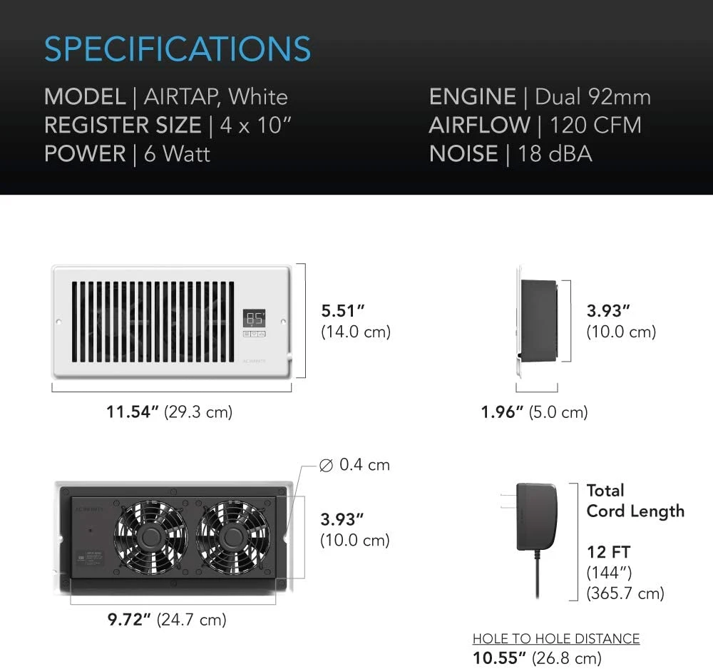 - Fits ONLY 4 x 10 in. Registers | Airflow: 120 CFM | Noise: 18 Dba | Includes Wall Adapter