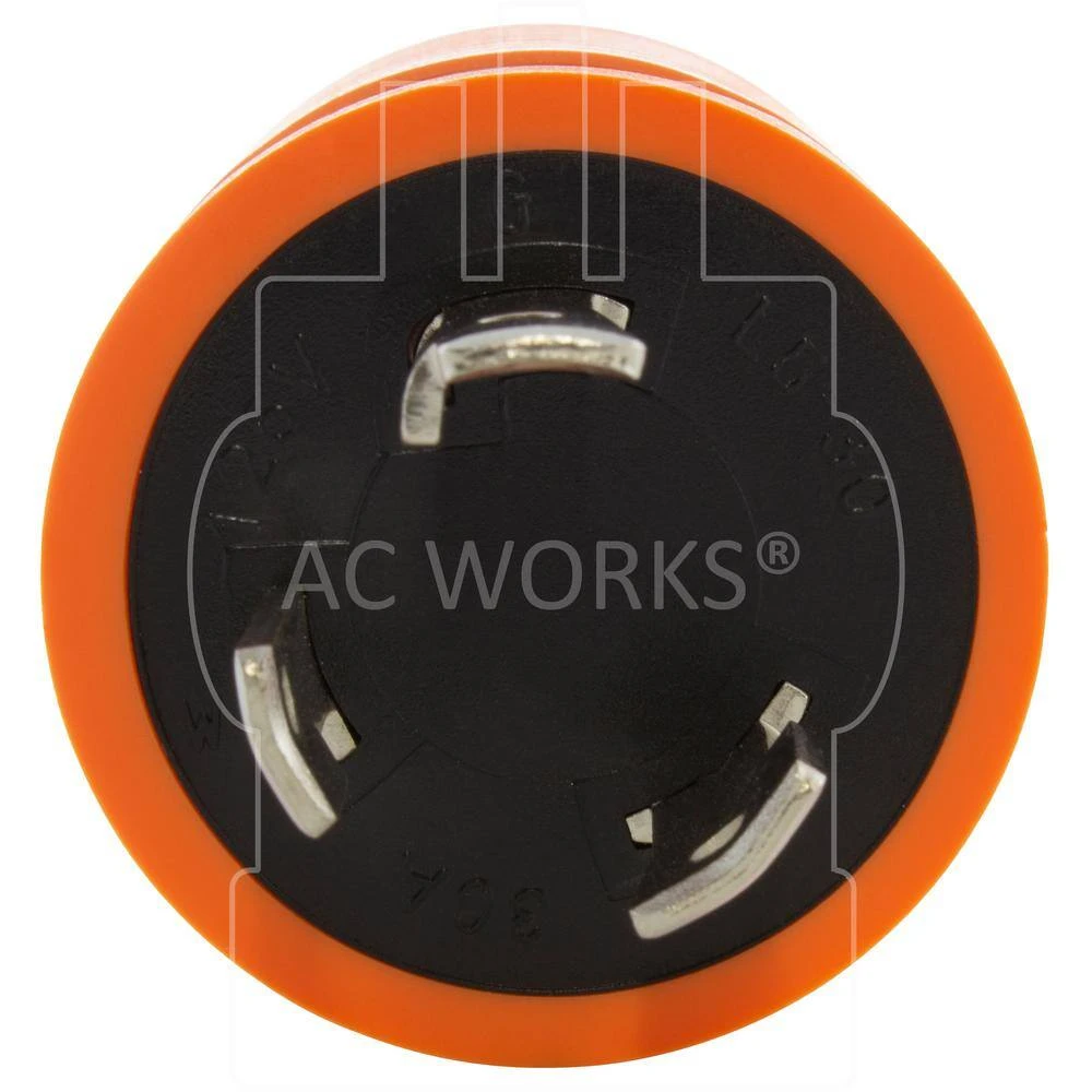This AC WORKS brand locking adapter is a very durable molded adapter. The locking adapter is a NEMA L5-30P to a NEMA L5-20R. NEMA L5-30P is a 30Amp, 125-Volt, 3-Prong locking plug. The NEMA L5-20R is a 20 Amp, 125-Volt, 3-prong locking female connector. This product has nickel-plated plugs and terminals to prevent rusting, is super durable, and has a maximum operational power of 2500-Watt. It also has a built-in power indicator light so you know the power is running. It is generally used for Marine Shore Power, RV/ Generator/ Industrial. Included is a 5-year limited warranty.