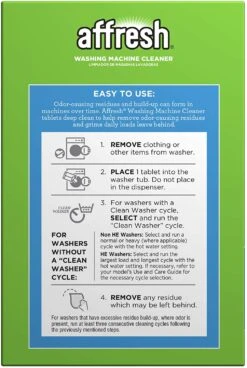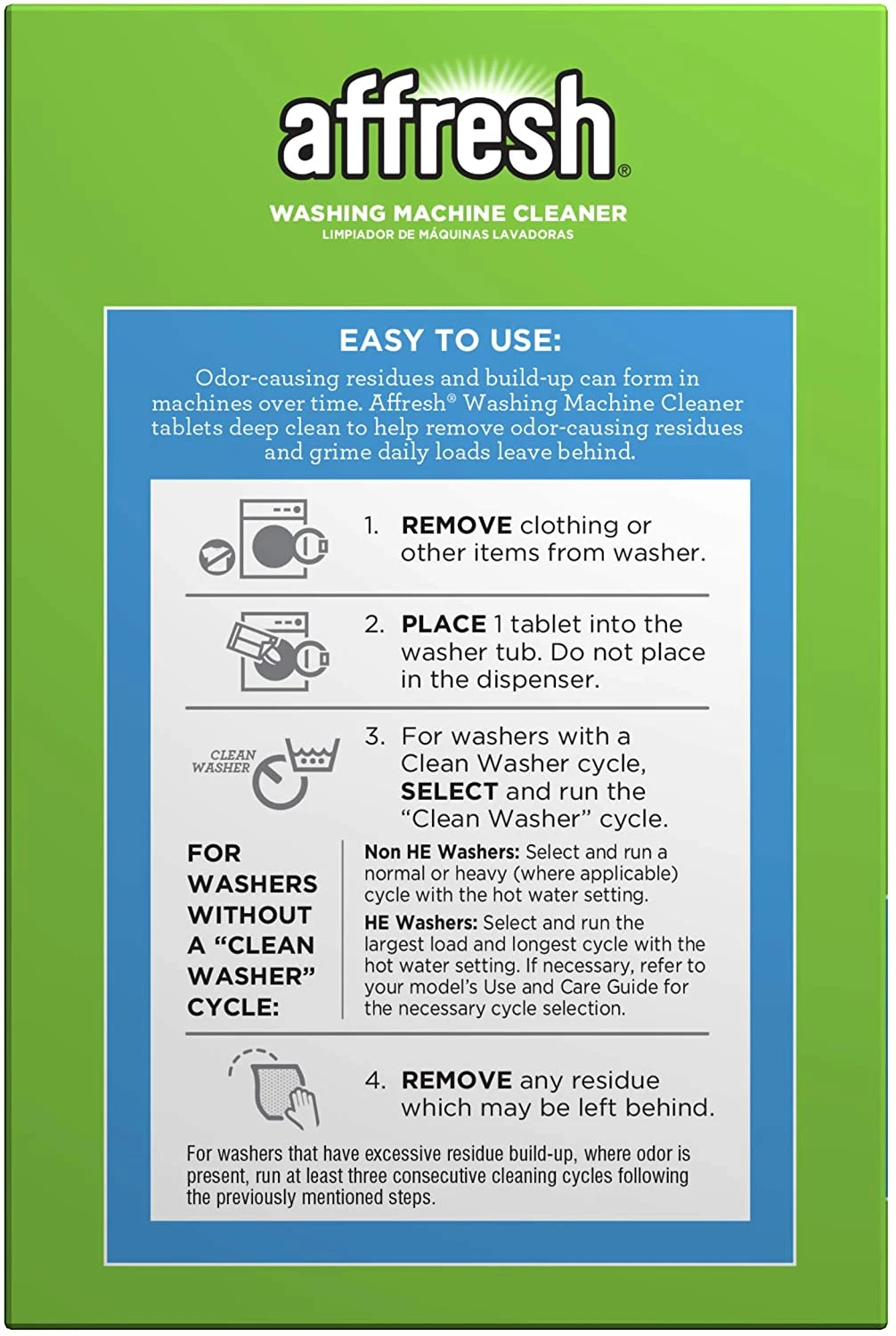 Simply place one tablet in the wash basket (without clothes) and run a Normal Cycle (hot option) or Clean Washer Cycle. Affresh brand is safe on septic tanks and safe for all washer components. Use once a month to keep your machine fresher and cleaner. Package includes six tablets.Please note that date on the package is production date and NOT EXPIRATION Date.