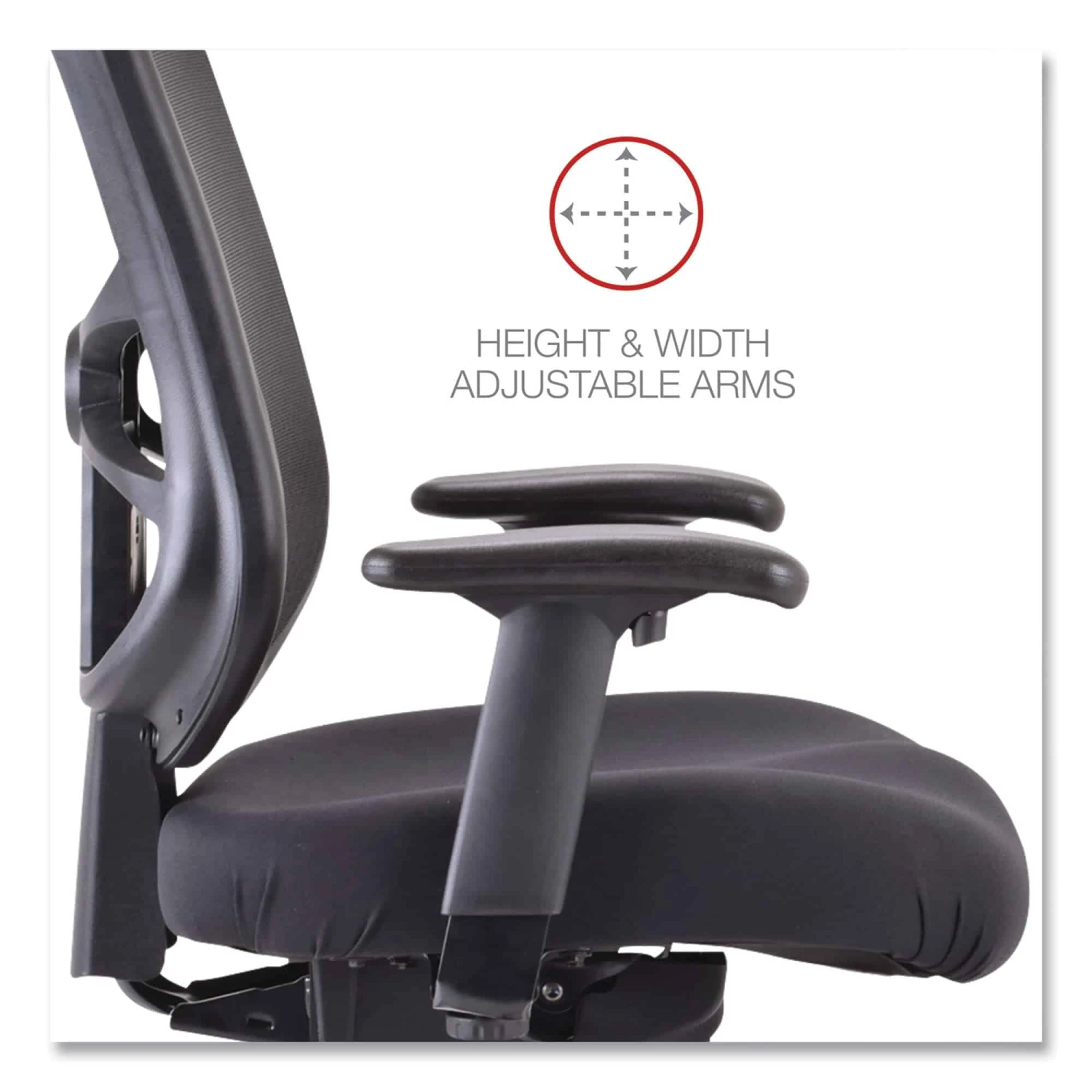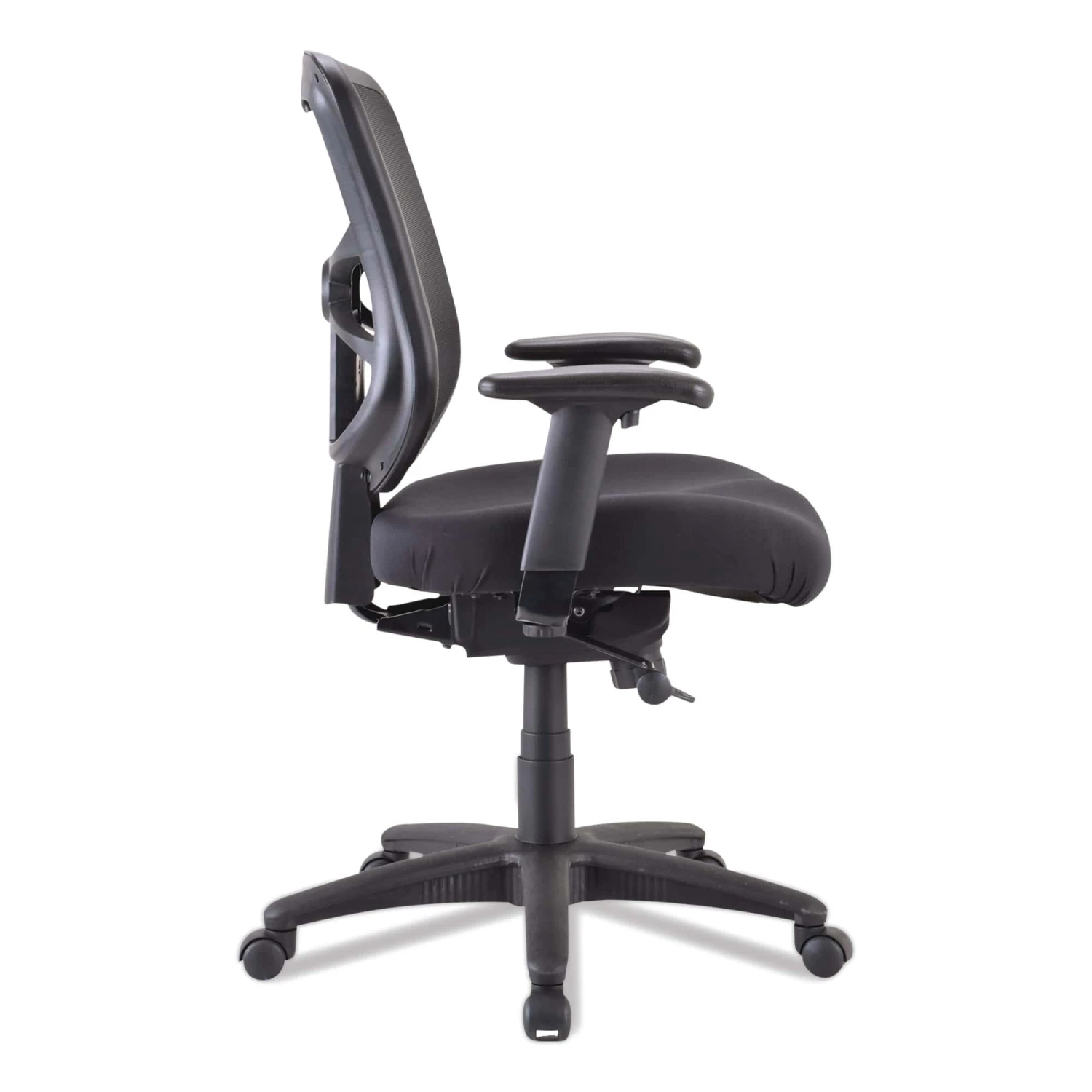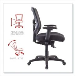 Alera’s ergonomic design adjusts to fit multiple users. Cool, breathable mesh back. Contoured seat cushion with waterfall edge to help relieve pressure on legs. Height- and width-adjustable arms with soft polyurethane pads. Five-star base with casters for easy mobility.