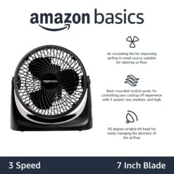 Amazon Basics 3 Speed Small Room Air Circulator Fan, 7-Inch Blade, Black, 6.3″D x 11.1″W x 10.9″H