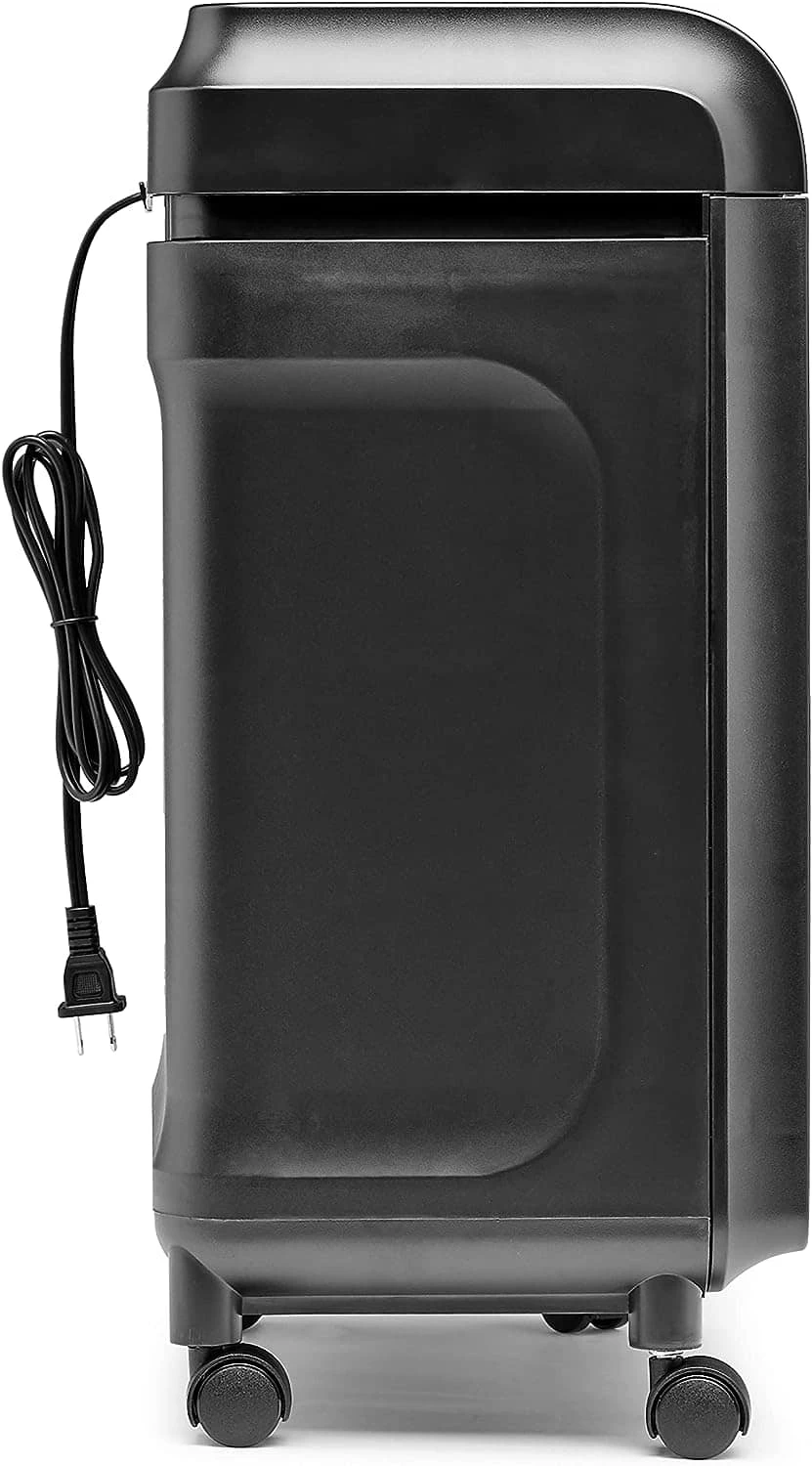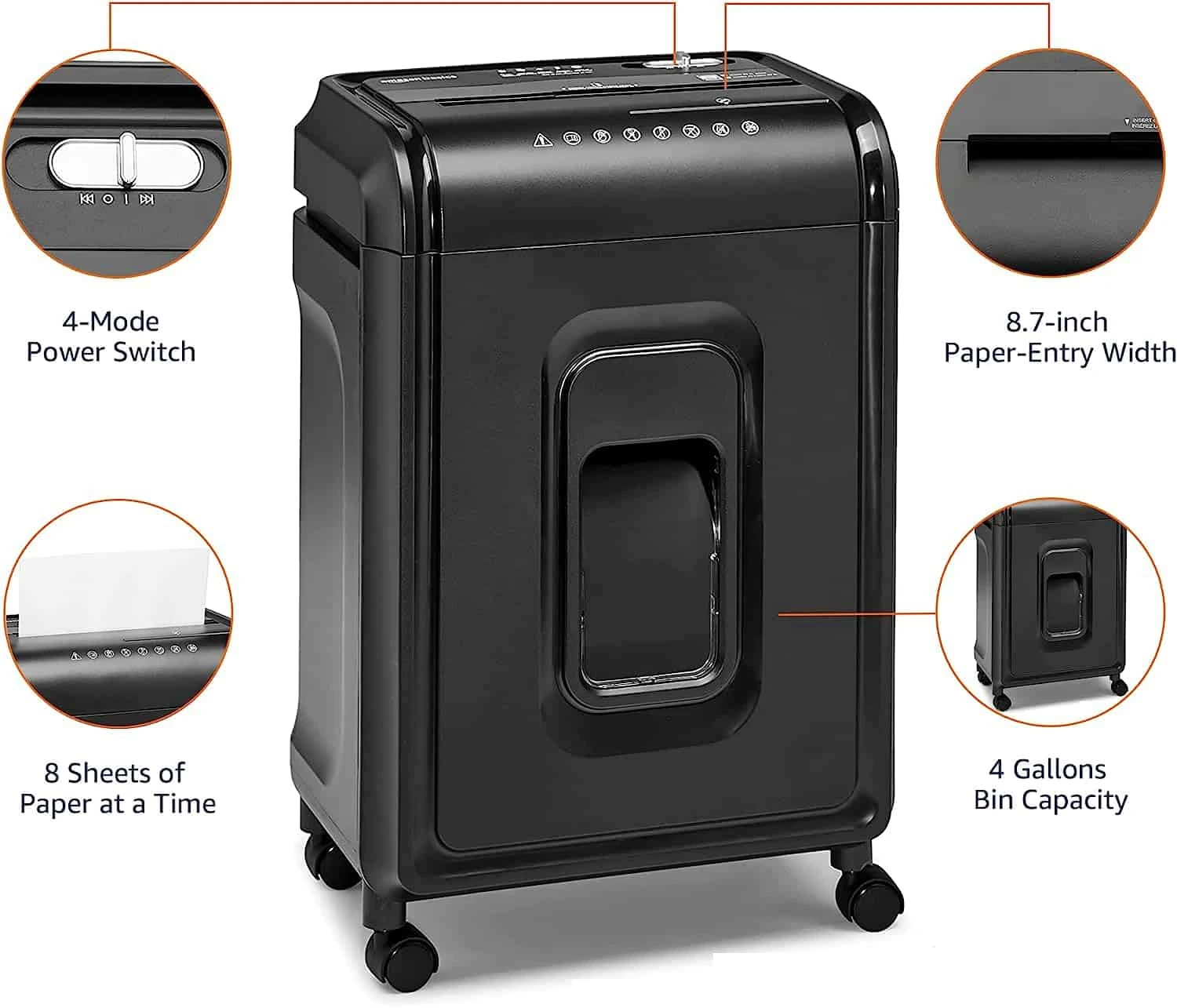 - 4-mode power switch (auto, off, reverse, forward); LED status indicators (bin full, door open, overload, overheat, power on); 8.7-inch paper-entry width; easy-to-empty 4-gallon pull-out bin; casters included