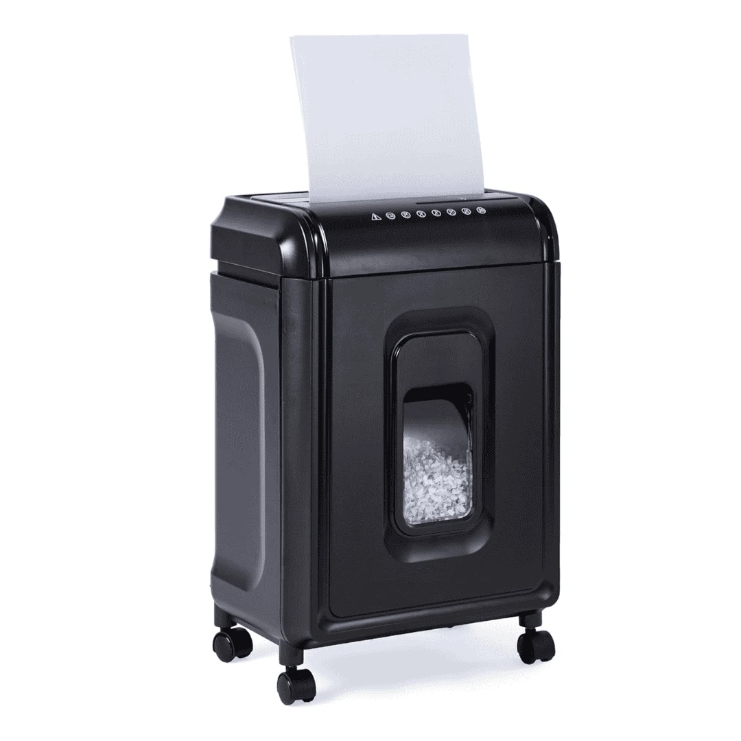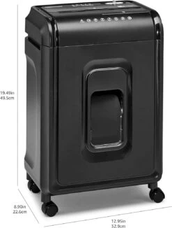 - Micro-cut shredder turns paper into tiny confetti-like pieces measuring 5/32 by 15/32 inches (4 by 12 mm); meets high security level P-4 standards; shreds 6x smaller than standard cross-cut shredders (2,235 pieces vs. 360 pieces)