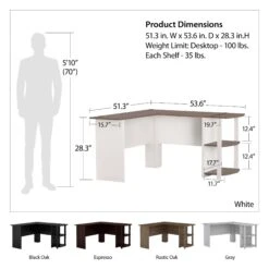 - The Desk ships flat to your door and 2 adults are recommended to assemble. The desktop can support up to 100 lbs. and the side shelves will each hold 35 lbs. Assembled dimensions: 28.31H x 51.34W x 53.62D