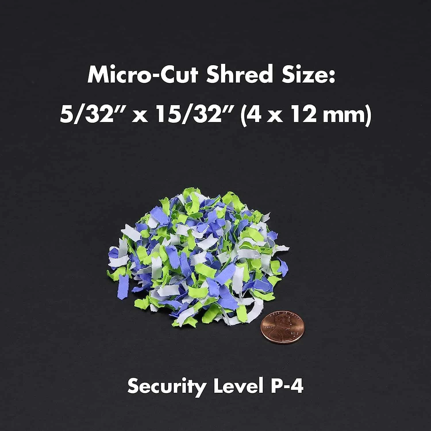 - Shreds paper, CDs, DVDs, credit cards into small pieces (5/32 by 15/32 inches), security level P-4