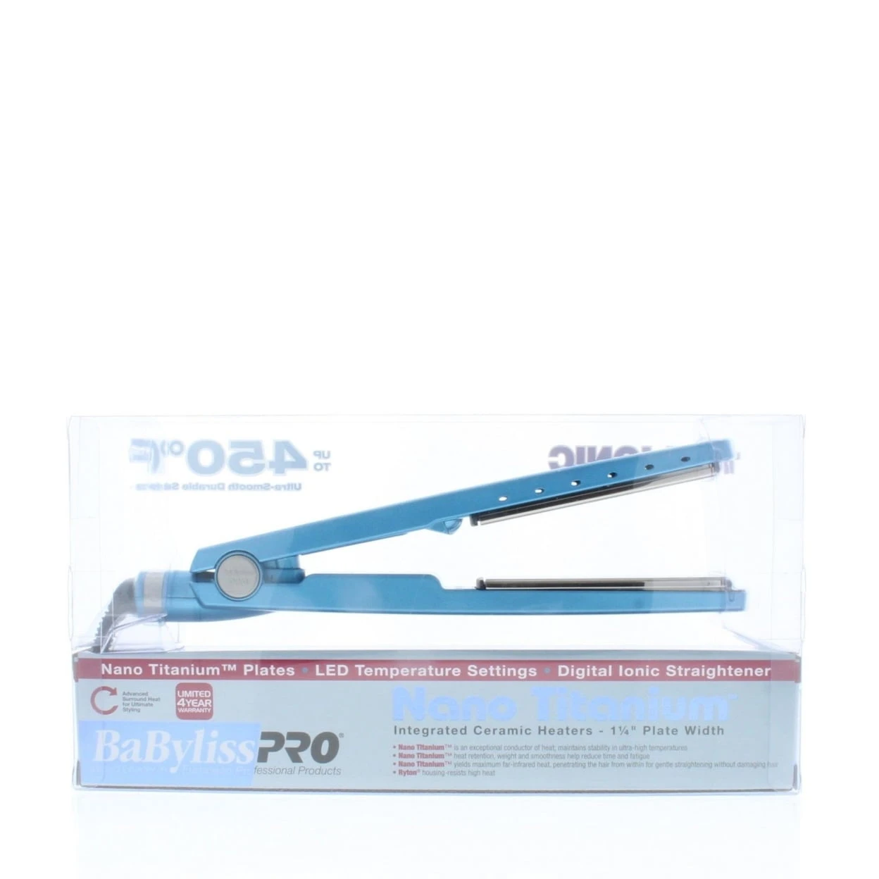 BaByliss Pro Nano Titanium Flat Iron This professional flat iron features a combination of Nano Technology with the high heat conductivity of Titanium and the heat-resistant properties of Ryton to deliver state-of-the-art performance with less stress and damage to the hair. The features include 1-1/4 inch Nano Titanium plates with Advanced Surround Heat to straighten your hair 40% faster, eliminating the damage multiple passes can cause. Digital ionic LED temperature setting up to 450 degrees F, lightweight, slim design. Color: Blue. Features: BaByliss Flat Iron in Blue.; Color: Blue.; Nano Titanium extra long 1-1/4 inch plates.; Swivel power cord.; Slim, ergonomic design.; Allows hair to glide through the plates effortlessly and fluidly for sleek, shiny results.; Advanced Surround Heat – provides exceptional straightening results in less time.; Maximum amount of far infrared heat to penetrate hair from within and straighten without damaging the hair.; Ionic Technology to smooth the hair’s cuticle, sealing in moisture and shine.; Ryton Housing – outer casing withstands excessive heat.; Nano Technology – Existing materials are reduced in size, enhancing their natural properties for maximum efficiency.; Extra long plates with a slim design to eliminate hand fatigue.; Recessed LED electronic temperature controls.; Built in Digital ionic technology.; Heats up to 450 degrees F.; Straightens hair up to 40% faster.; Built-in ionic generator.; Titanium: Provides superior heat conductivity, exceptionally resistant to chemical corrosion, as strong as steel with only 60% of its density, the smoothest surface available in styling tools.; To flat iron: make sure your hair is dry, and then divide it into medium-sized or wide sections. Adjust the temperature on the iron using the temperature dial. (Use lower temperatures for fine or thin hair, higher temperatures for thick or coarse hair. We recommend keeping it between 180 and 350 degrees.) Apply a heat protectant to the section, clasp the flat iron plates at your roots and then glide down your hair to the ends. Repeat if necessary. Move onto the next section and continue until all of your hair is silky smooth. Product Options Available are as follows: Option: 1.25″ inch – Flat Plates – Babyliss Pro Nano Titanium Integrated Ceramic Heaters Iron; 3.33