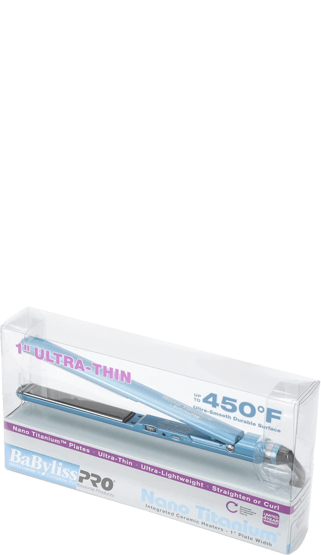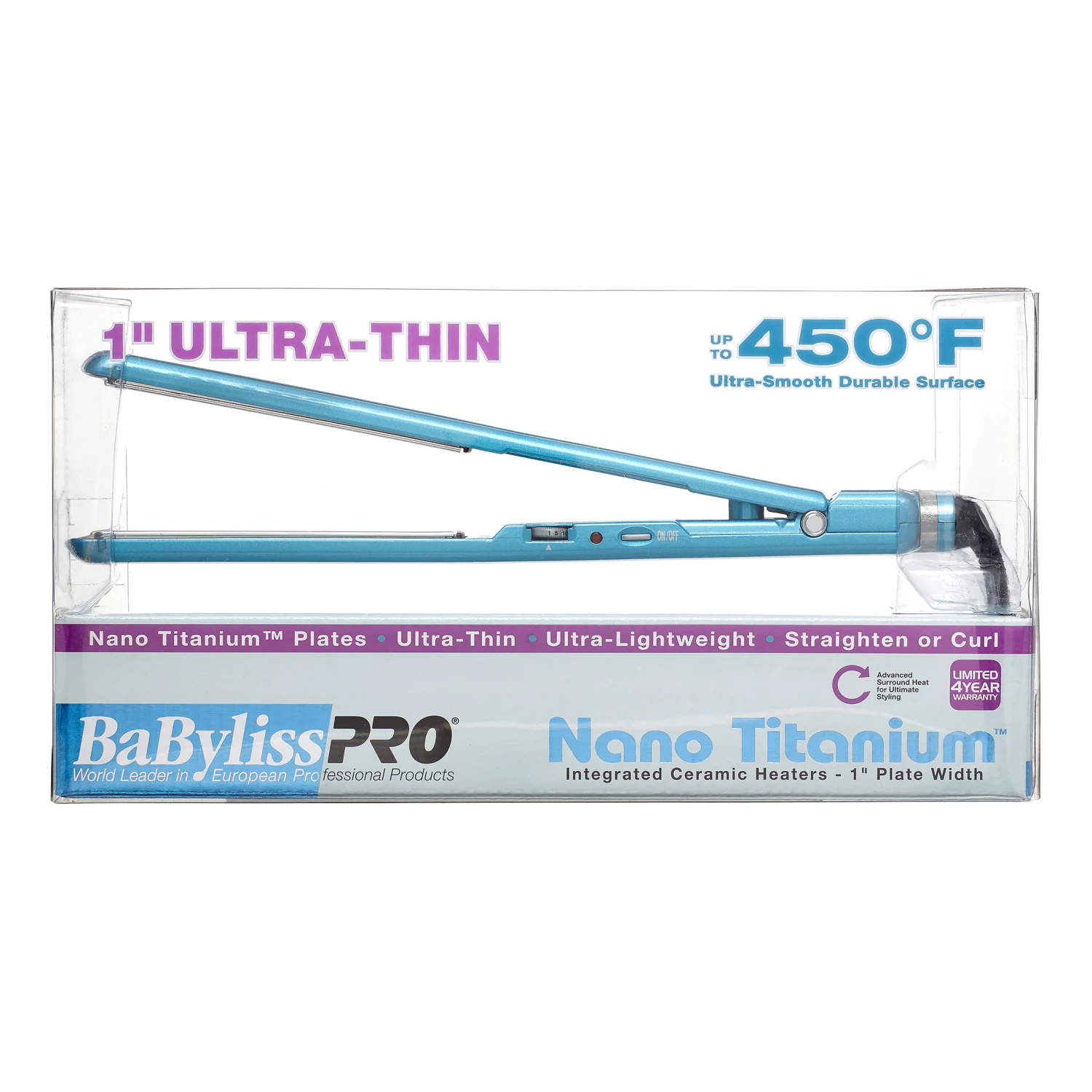 Create a look to fit almost any style with the BaBylissPRO Nano Titanium Ultra Thin Flat Iron Straightener, 1âł. The plates are designed to easily glide through your hair without a single snag in order to avoid pulling and breakage. This BaByliss Pro straightener features heaters that deliver instant results and quick recovery. The thin plate size is ideal for creating smooth, bouncy curls for a day at work or a night out on the town. The ceramic heater produces instant heat up to 450 degrees Fahrenheit while promoting fast heat recovery for styling efficiency with no damaging hot spots. This hair straightening iron has an ultra-smooth titanium plate that resists corrosion to help ensure long-lasting use. It also straightens hair up to 40 percent faster than other leading models.