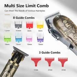 - [ More Than 15 Accessories] Wireless hair clippers kits equipped with 8 colorful guide combs (1.5,3,4.5,6,10,13,16,19mm),T-blade zero gapped trimmer equipped with 3 guide combs (1, 2 ,3mm) , nose hair trimmer,barber cape, cleaning brush, 3 USB charging cables, and barber’s comb.