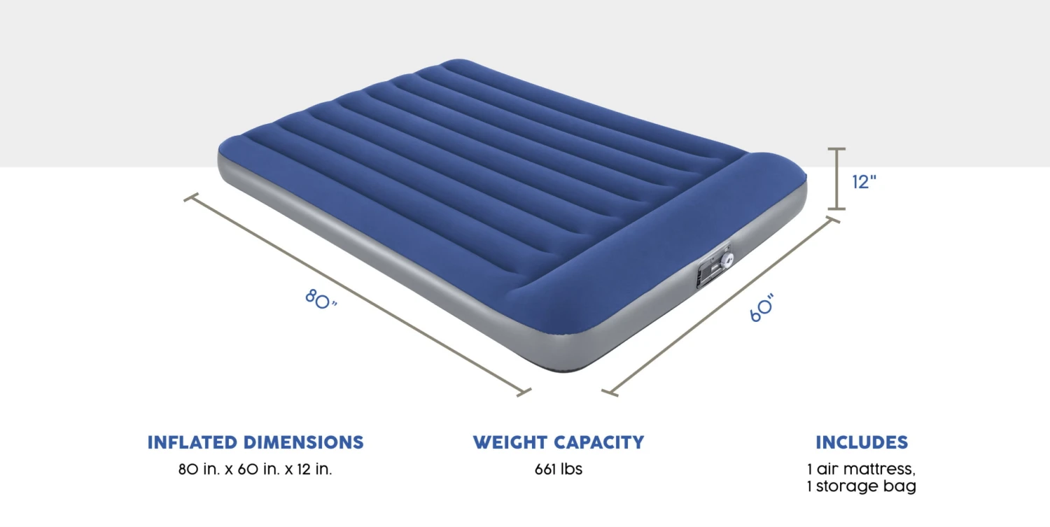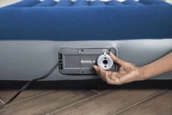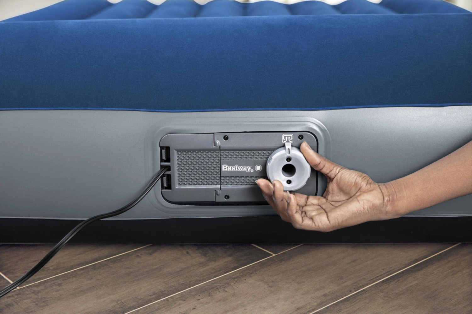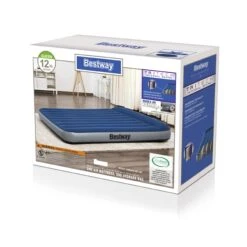 Wake up renewed and refreshed on the Bestway 12″ Queen Air Mattress with Built-in Pump. This strudy, queen-sized bed promises strength, durability, and comfort all night long. Its compact size and built-in pump make it quick and convenient for use whenever you need it. The solid blue print elevates the luxurious look of this air mattress and is perfect for any theme. This air mattress freatures tritech construction and can withstand the stress, weight and movement that comes with a good night sleep.