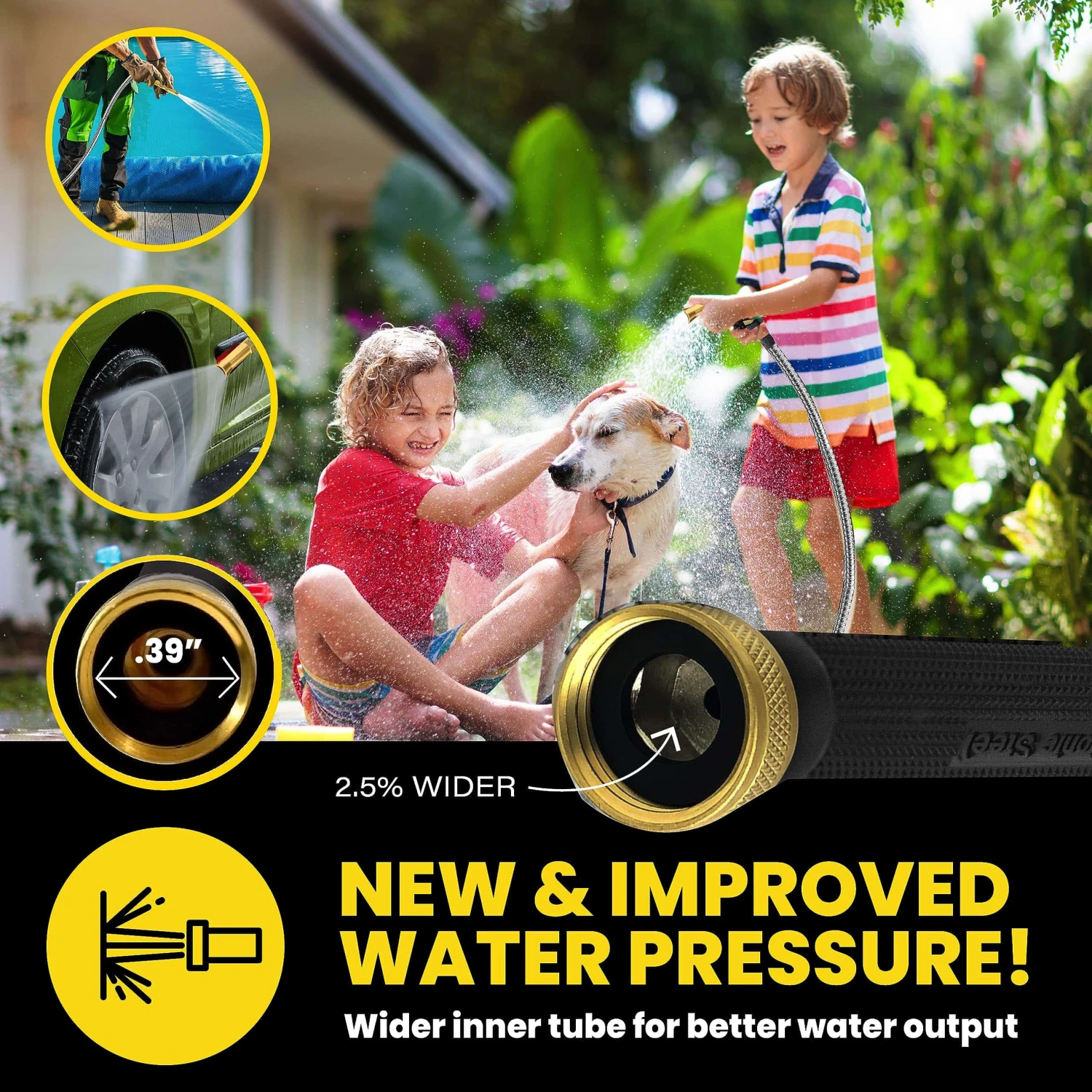 Upgraded for 2023, the Bionic Steel garden hose has been reimagined with an improved design, brass crush resistant fittings & stabilizer collar, and a multipurpose fireman’s nozzle all make this the best engineered hose capable of withstanding extreme force while the on/off valve makes the output easy to control.