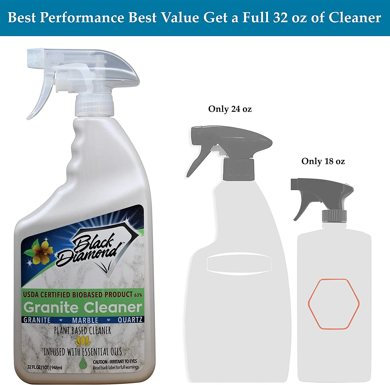 Black Diamond Stoneworks Granite Counter Cleaner: USDA Certified BIOBASED- Safe for Granite, Quartz, Marble, Travertine, Countertops. Black Diamond Stoneworks’ Granite Cleaner is a premier product designed specifically for the care and maintenance of high-end Granite, Marble and Tile counter tops. Granite is the fastest growing counter material in the United States. Due to the high cost and unique properties of this material, owners need a product specifically designed for Granite and other high end counter tops. This 100-percent biodegradable daily cleaner is safe to use on all kitchen, bath and other marble, granite and tile counter tops. The streak-free formula has been tested and approved by marble and granite professionals to quickly remove dirt and grime from tile and stone counter tops without leaving behind soap scum, streaks or a rainbow effect that is common in All Purpose cleaners. The pH neutral formula is gentle and will not remove expensive and time consuming sealers. With daily use Granite Cleaner helps to maintain stones factory finish with a brilliant, streak-free shine. Made in USA.Tired of dull or streaked countertops. Granite Cleaner is a PH neutral cleaner for use on granite, marble, travertine, limestone, ceramic tiles and other man-made and natural surfaces. Leaves your counters looking great without leaving dulling residue or streaks. This convenient 950ml spray bottle makes cleaning easy. Use daily. For added protection and cleaning ease use Black Diamond Polish Preserver every two weeks and seal once a year with Black Diamond Nex-Gen Stone Sealer.