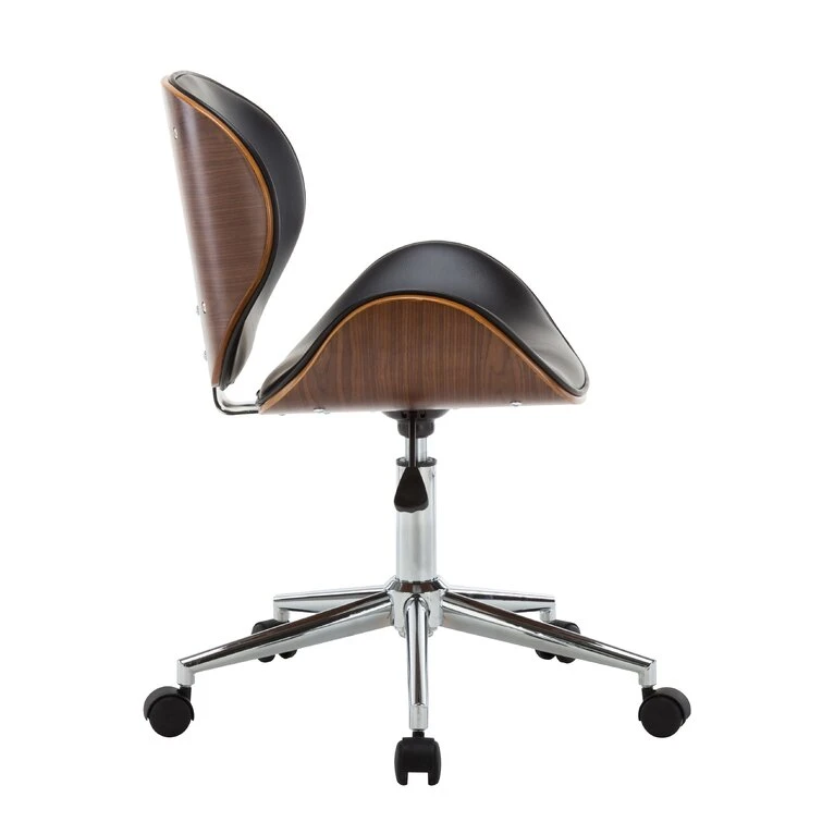 Inspired by iconic mid-century modern designs, this dapper desk chair brings curated sophistication to your home office ensemble. The stylish seat features a curvy bentwood shell in a rich walnut finish, while the cushioned inside is upholstered with easy-to-clean black faux leather upholstery. Sporting a gleaming chrome finish, the classic metal five-point base includes a lever-operated pneumatic lift for seat height adjustment, a 360° swivel mechanism, and five hooded caster wheels so you can glide from task to task with ease.