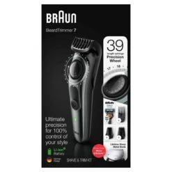 Achieve your style effortlessly with the Braun BT7220 beard trimmer & hair clipper for men. The BT7220 features a precision dial with 39 length settings and comes with Lifetime Sharp Metal Blades and Li-Ion battery. Washable trimmer head and comb.Box includes: 1 x Beard trimmer & hair clipper2 x Precision beard & hair combs1 x Gillette Fusion5 razor1 x Detail trimmer head1 x Mini foil shaver1 x Smart plug charger1 x Cleaning brush1 x Soft bagUser manual Warranty