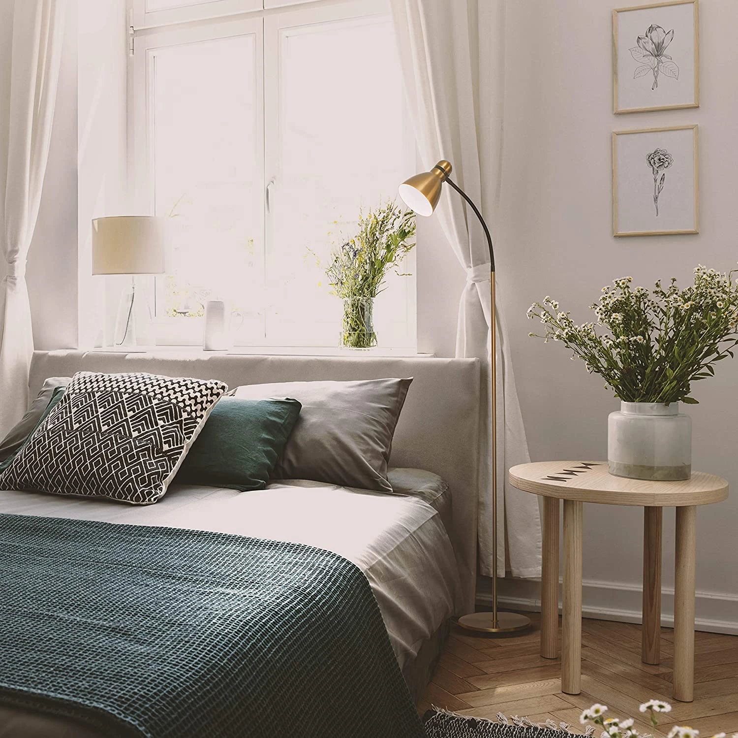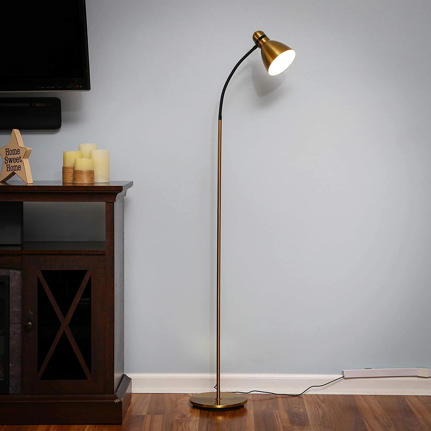 - The lamp’s simple set up and slim design allows it to fit as easily behind a couch as in a corner or hallway. Its weighted base makes it wobble free and safe around kids and pets