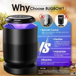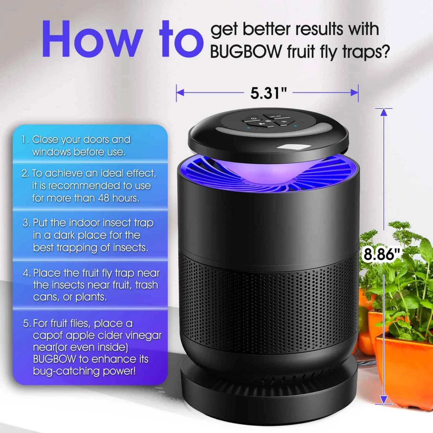 - Convenient Remote Control Fruit Fly Trap: The included remote control operates the fly trap indoor from a distance, and 98ft Control distance. Switch, light brightness, fan speeds, Auto mode / Manual mode, all features in one modern control panel. You can comfortably lie on your bed and control our BUGBOW indoor mosquito trap.