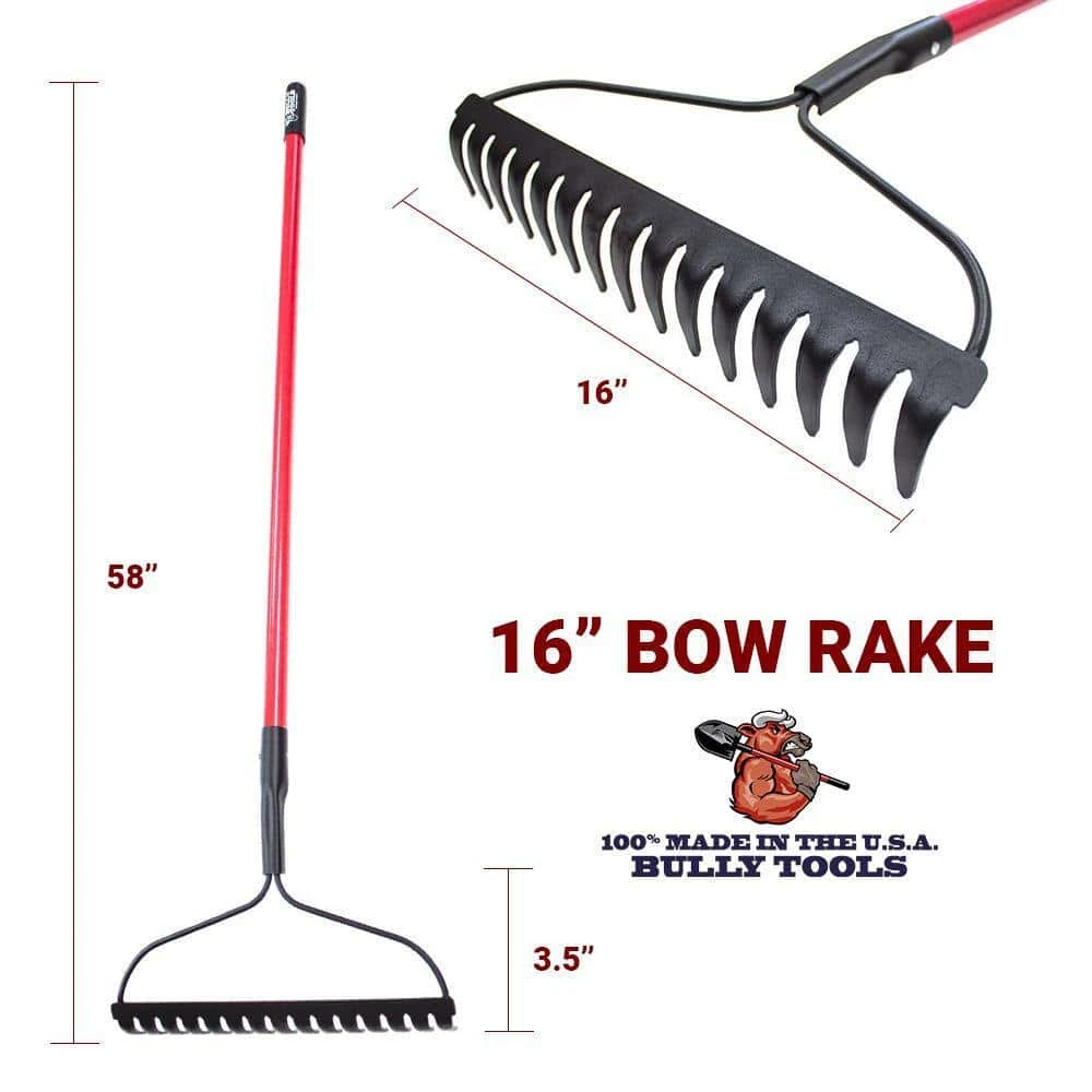 The best rake for any serious yard and garden job, our Bow Rake can handle anything from dirt, to mulch, to rocks. The Bow Rake is an essential tool for all gardens because of its versatility: smoothing soil, breaking up dirt, raking debris, leveling mulch, moving rocks, and much more. Its heavy-duty construction with ribbed teeth and reinforced ridges makes it possible for you to break up even the most compacted soil. Its specially designed rake-head indentations help you scoop more material with each individual tine. Since the head is welded to the handle and the steel components are over-welded, the Bow Rake won’t separate no matter how tough your garden project-no simple wood-handled big-box rake can boast that. This might be the last bow rake you will ever need to buy. Constructed with heavy duty 10-gauge 100% Made In The USA steel, it’s up to 30% more durable than foreign competitors, and the handle is made from high quality fiberglass and coated in a polyester veil to prevent splintering and increase strength, plus a rubber grip to for the most comfort handle while on the job. The Bully Tools 16″ Bow Rake with Fiberglass Handle comes with a limited lifetime warranty that protects against defects in material and workmanship.