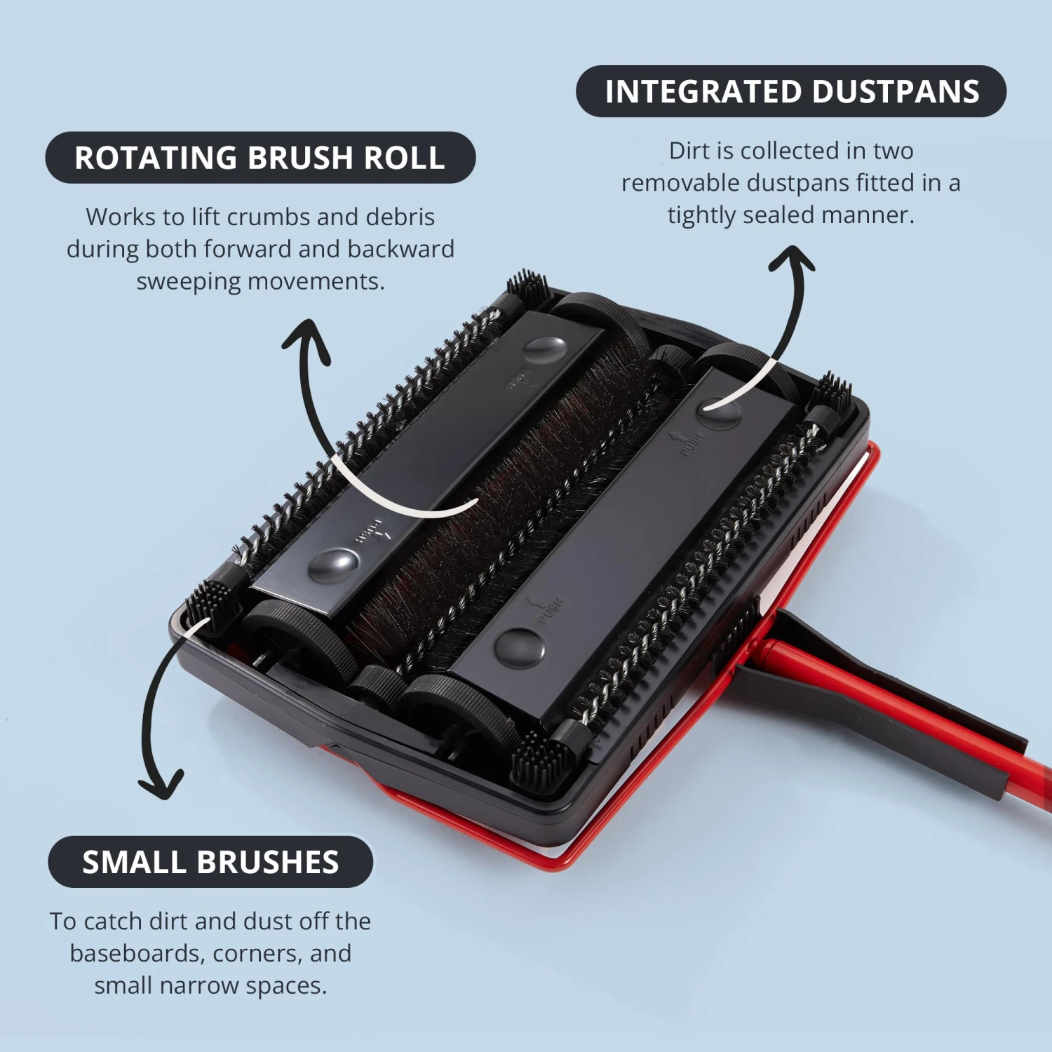- COMPACT AND INNOVATIVE DESIGN: Casabella’s Carpet & Floor Sweeper blends compact design with advanced cleaning technology. Its natural boar bristle dual-direction brush effortlessly captures debris, while smartly integrated dustpans inside simplify dirt collection. Achieve a clutter-free home without compromising on efficiency, embracing a cutting-edge cleaning companion for a spotless living space.