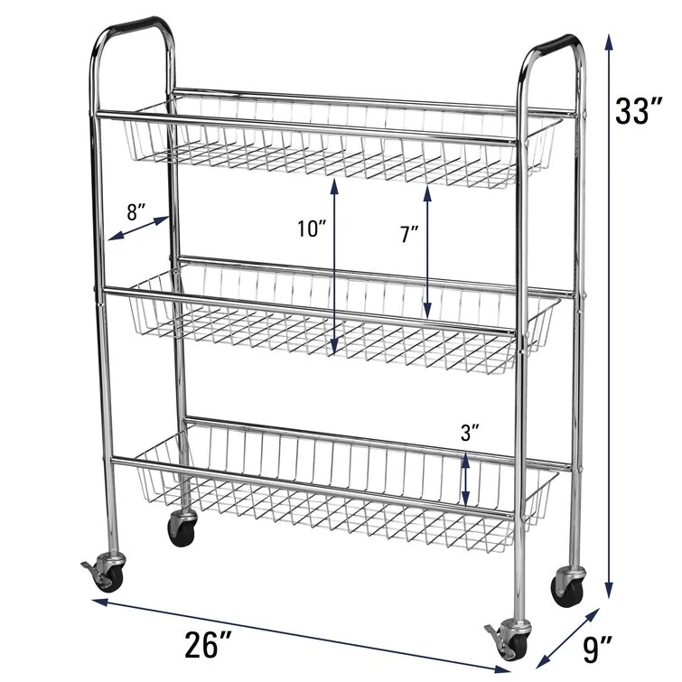 Turn that unused space into well-used space with this Chase Utility Laundry Cart from Household Essentials®. The design slides easily into any space and can hold larger size bottles and boxes. With this 3-tier 9 inches depth Utility Cart turns that unused space into well-used space . Its sleek design slides easily into just 10 in. of space. The wheel casters keep it easily mobile, so that you are able to slip it between the washer and dryer or easily maneuver in a utility or mud room! It is constructed with a sturdy steel frame and applied with a clean environmentally friendly CHROMELIKE luxurious powder coat finish. As well as, three storage baskets effortlessly accommodating standard and oversized laundry bottles and boxes. Plus, this crafty little cart may soon be your favorite rolling storage basket for ideal small spaces.