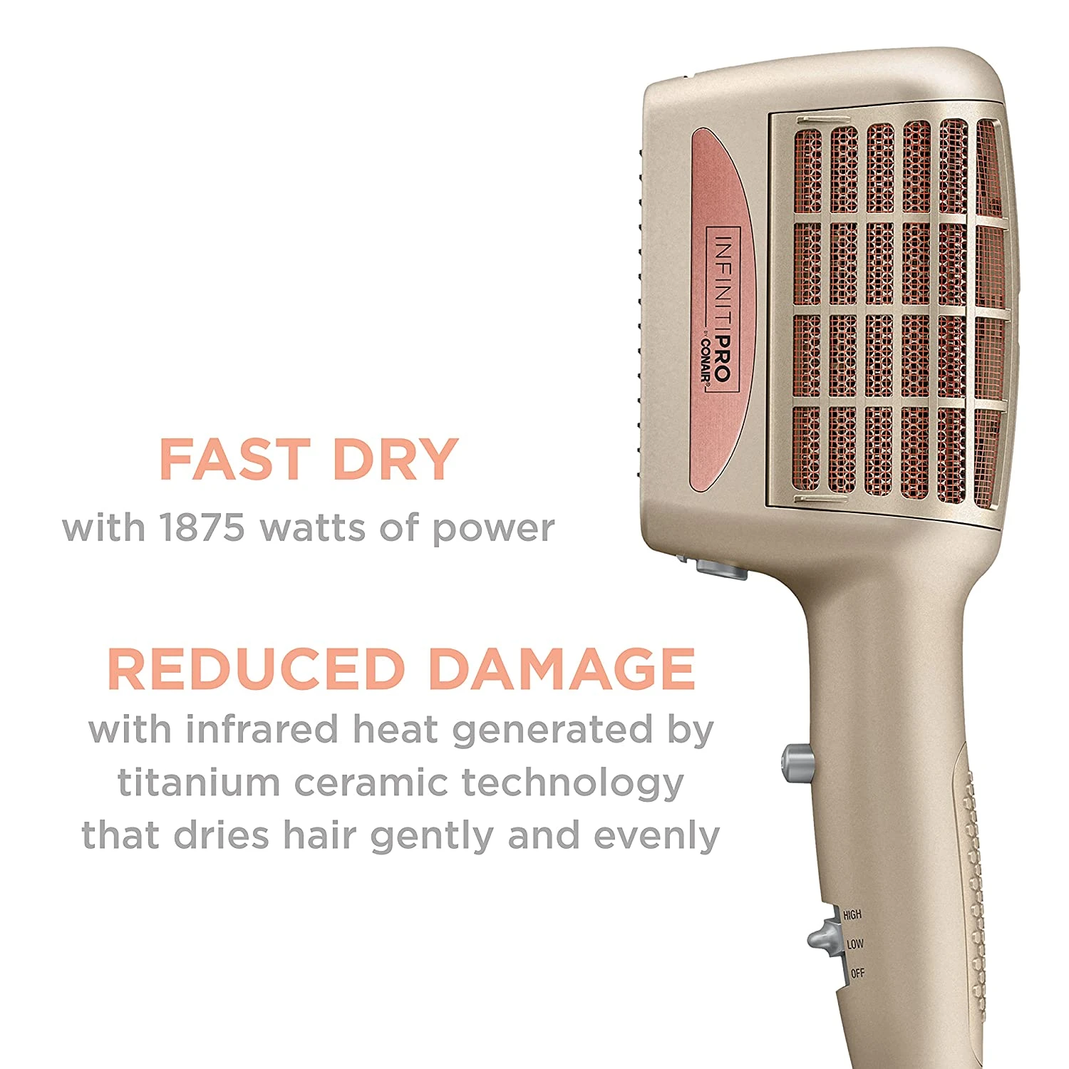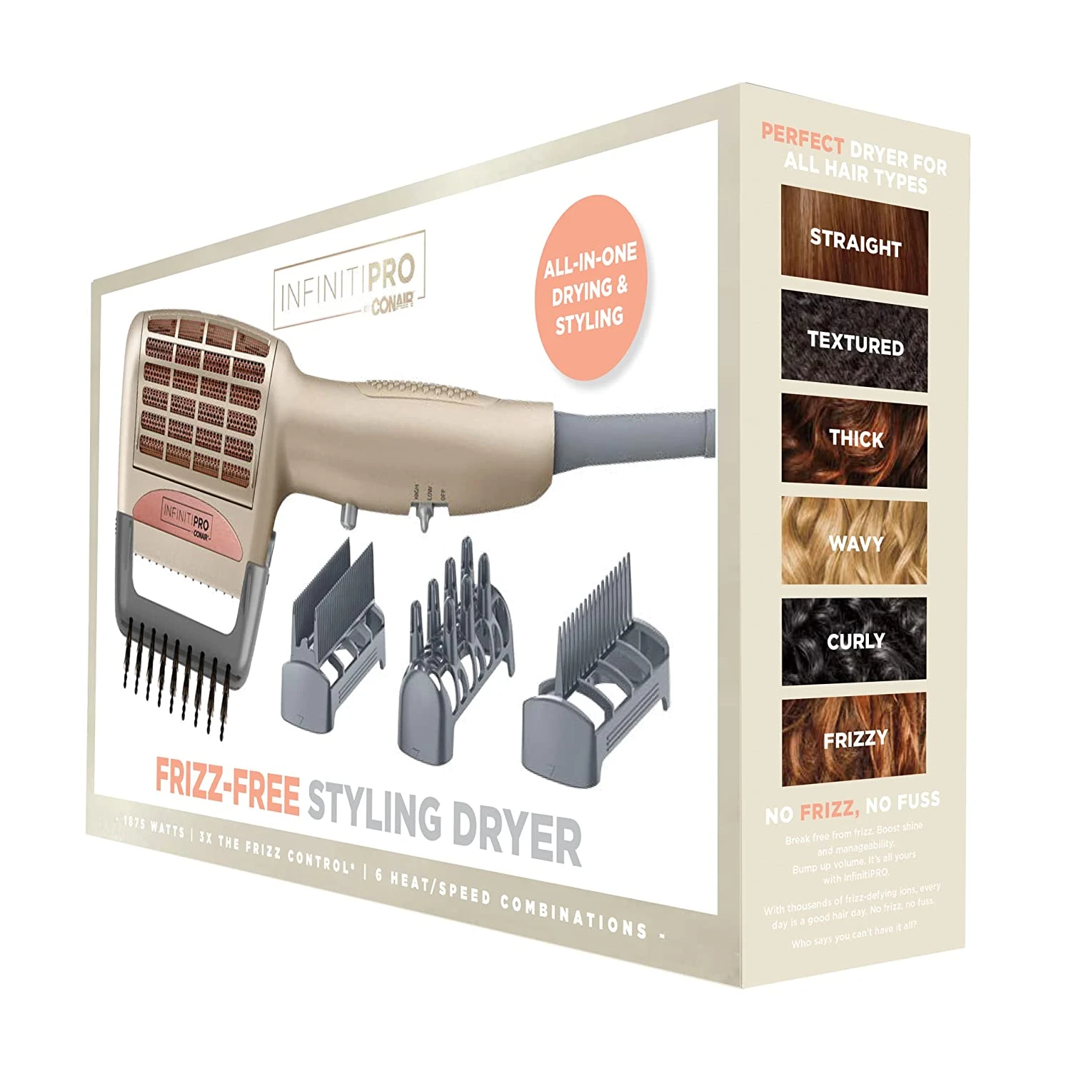 - Show Frizz Who’s Boss: The INFINITIPRO BY CONAIR Frizz Free Styling Blow Dryer has 1875 Watts for powerful, quick drying, and titanium ceramic technology that creates even heat to protect hair from damage.