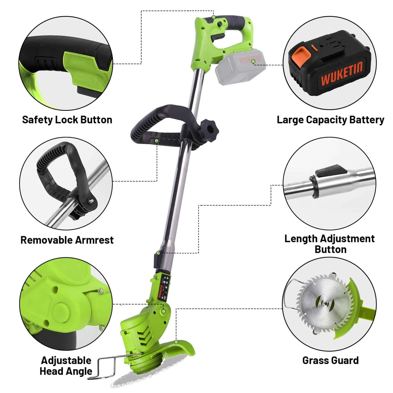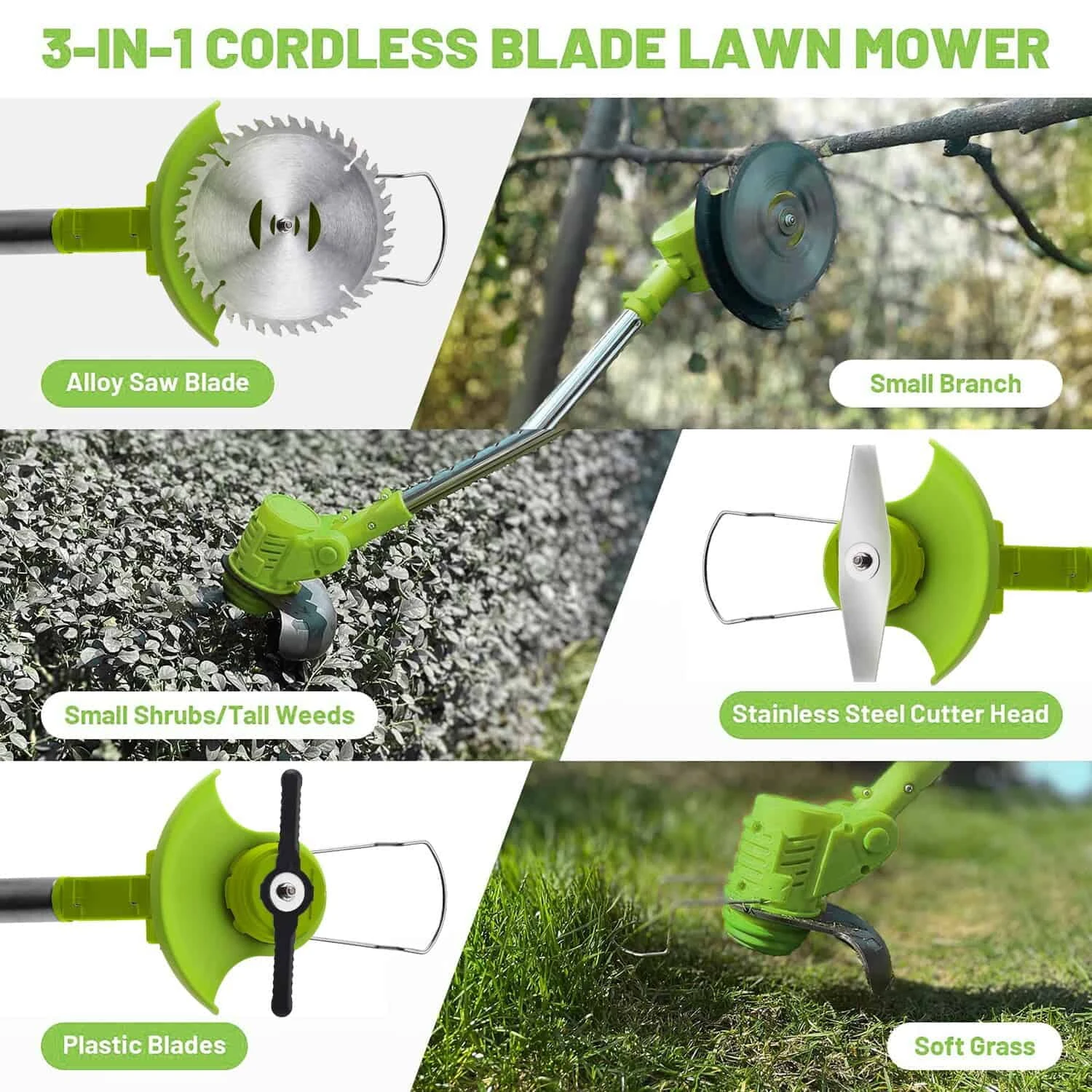 - 【11Pcs 3-Types of Cutting Blades】: Cordless Brush Cutter with 3 type funtional blades-Plastic blades are suitable for mowing soft grass; Fast cutting metal blades are suitable for mowing lawns, weeds and small shrubs; Manganese steel circular saw blades are suitable pruning thicker shrub branches.