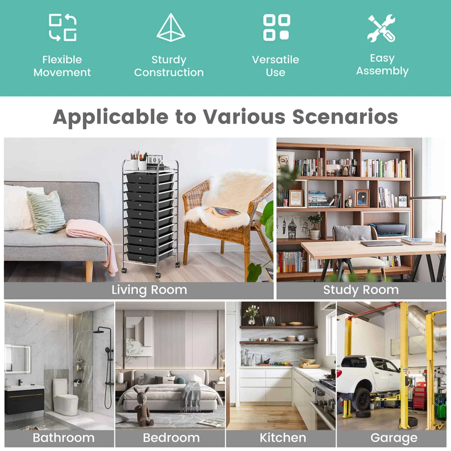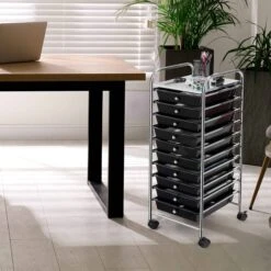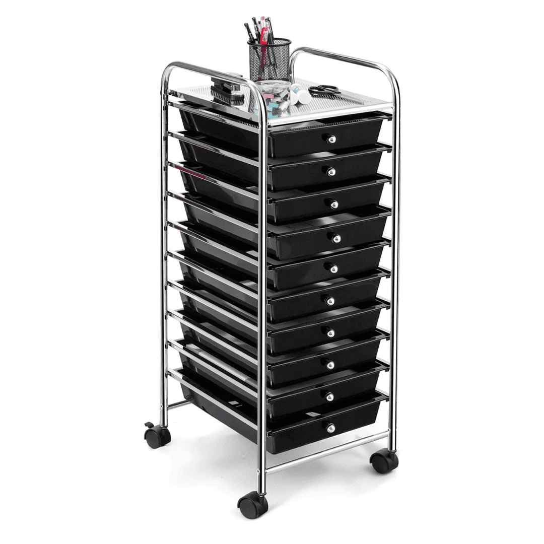 10 Drawer Rolling Storage Cart,which is ideal for getting your your work and life space easily in your office, home, school, garage or just about anywhere organization is needed.It is of chrome plated steel framed and 10 Removable PP Drawer Organizer.