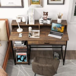 Costway 48βComputer Desk with Monitor Stand Home Office Writing Desk with Storage Drawer and 2 Open Shelves Rustic Brown