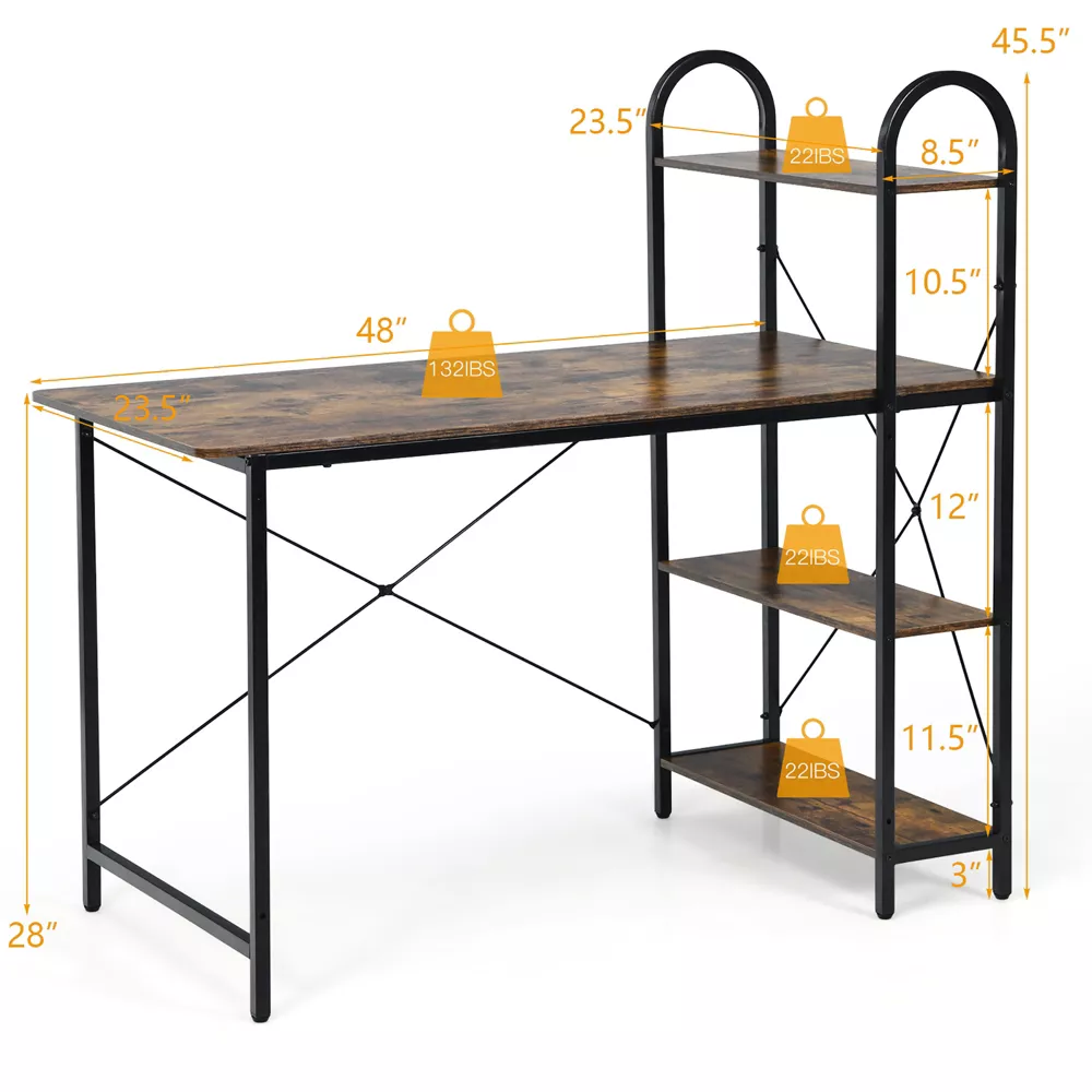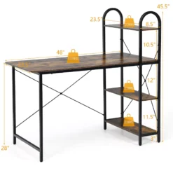 Are you still troubled by a workstation that is not spacious enough? It’s time to change to a wide computer desk. Designed with the metal construction, the computer desk is excellent in sturdiness, which shows in the overall weight capacity up to 198 lbs. The dimension of the desktop is 23.5” x 48”, which is spacious enough for a common computer and other items. On the side, there is a 4-tier open shelf where you can store many office supplies. As the shelf is reversible, you can freely place it in the right and left corners. Therefore, it is very suitable for small rooms.