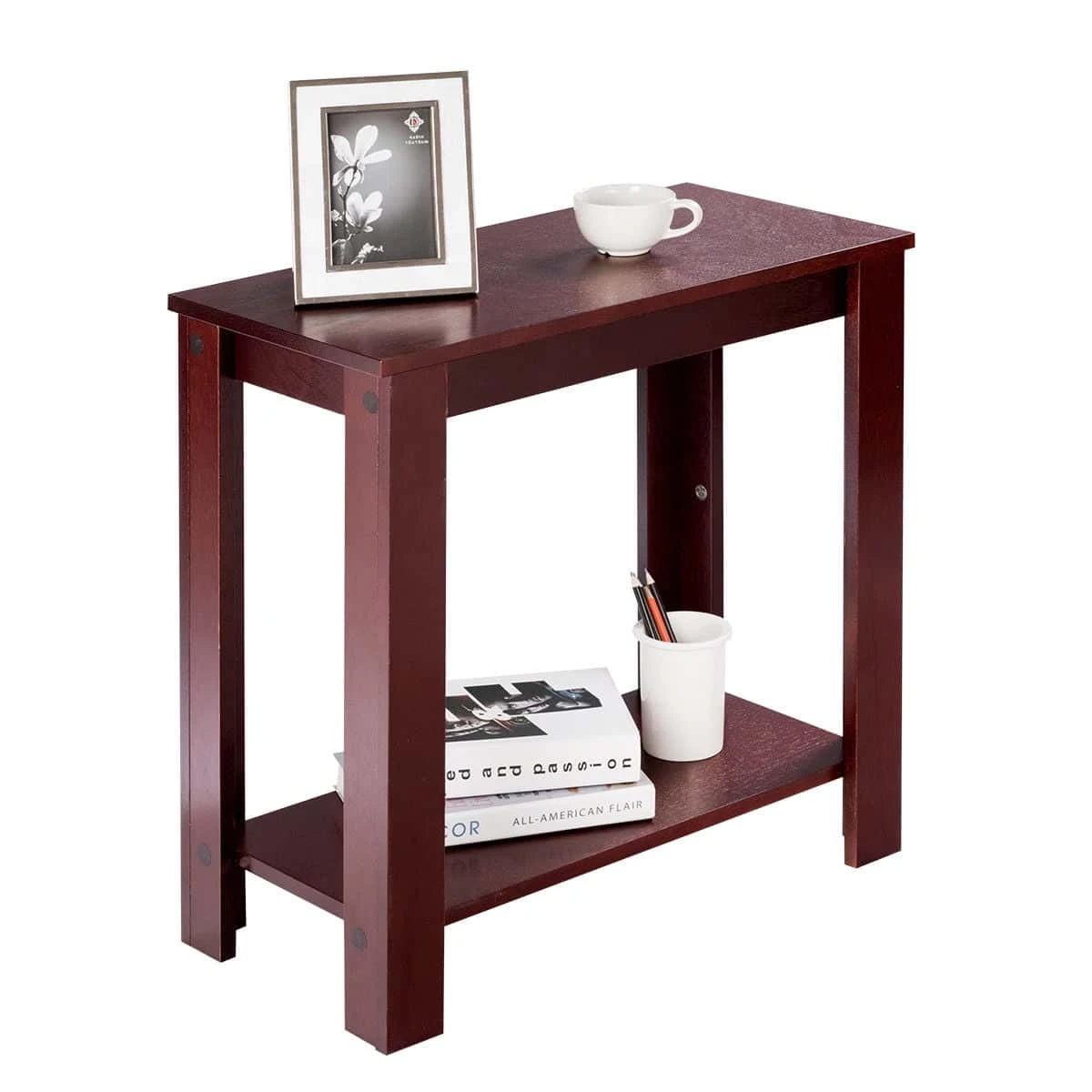 Chair side table is an easy fit for any spot in the home. A shelf at the base offers additional storage. Made from a combination of solid wood and wood veneer, the end table will not wobble, warp or split. Don’t hesitate to buy it!