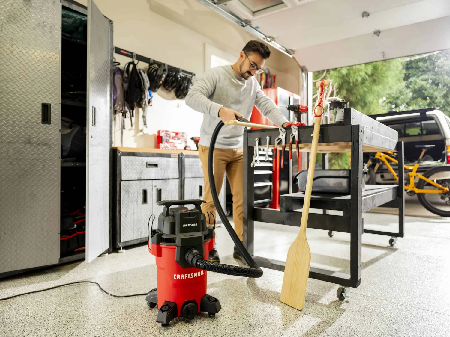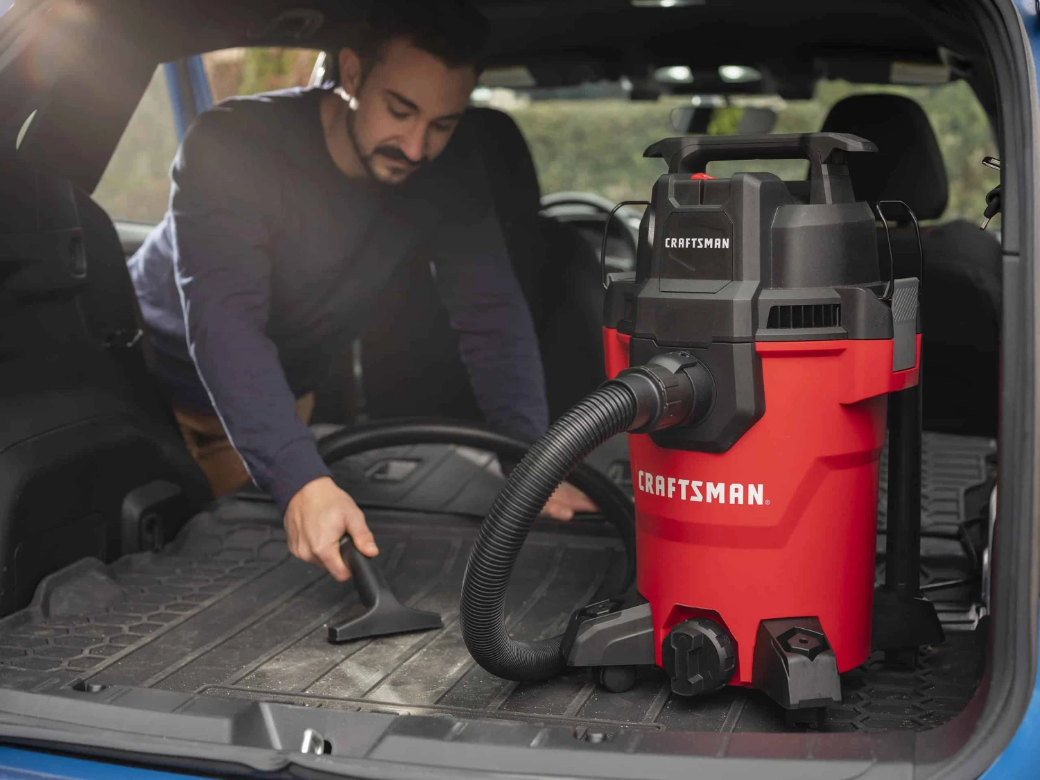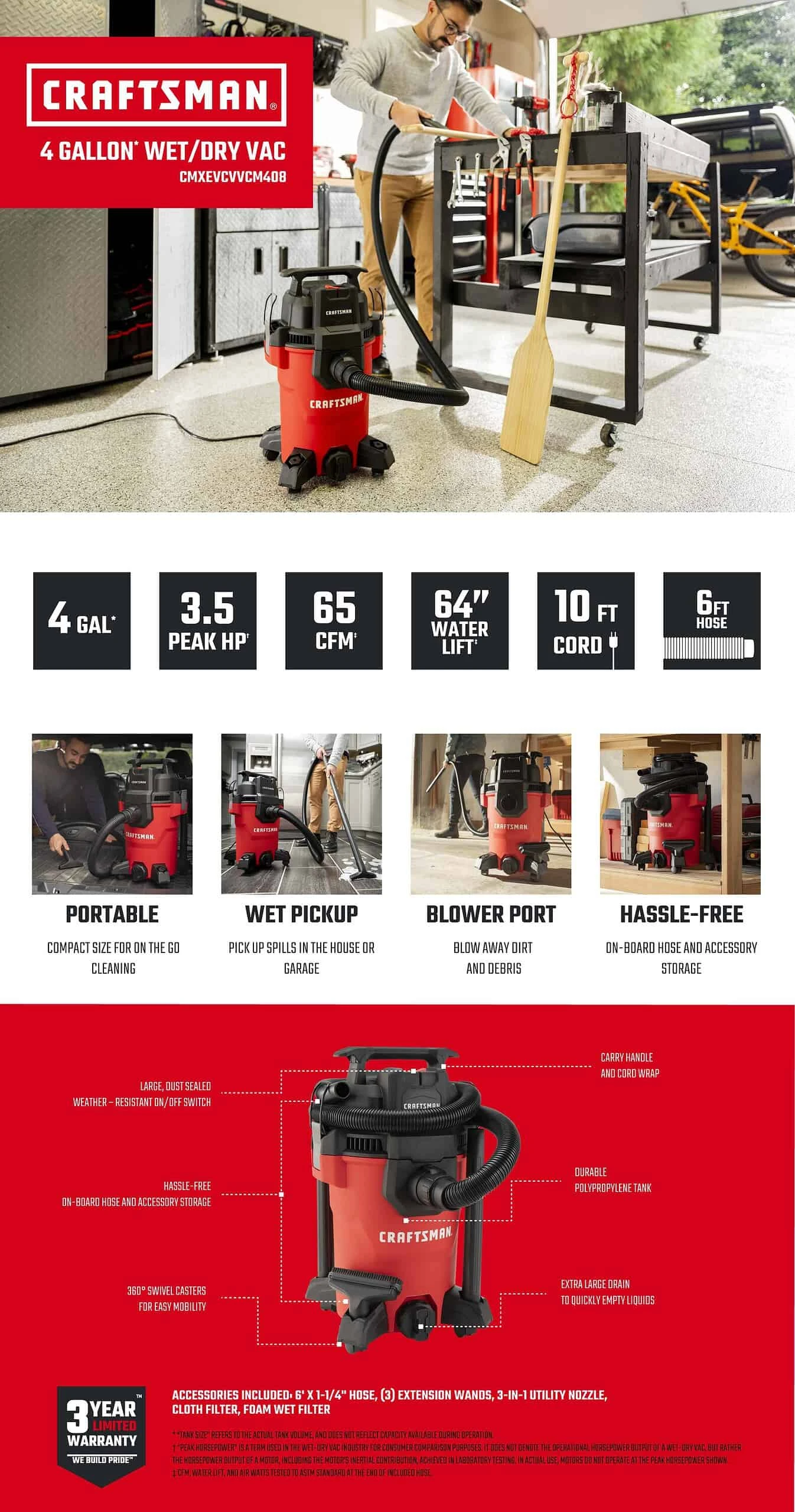 This 4-gallon Craftsman wet/dry vacuum is the perfect size for a variety of tasks around the house or garage. With a 3.5 peak HP† motor this vacuum makes clean-up easy, whether it’s liquid spills in the home or cheerios in the car. The top handle design and 360° swivel casters provide easy mobility during and after use. Turning this vacuum into a blower to remove debris from your yard or garage could not be easier – all it takes is a simple conversion.