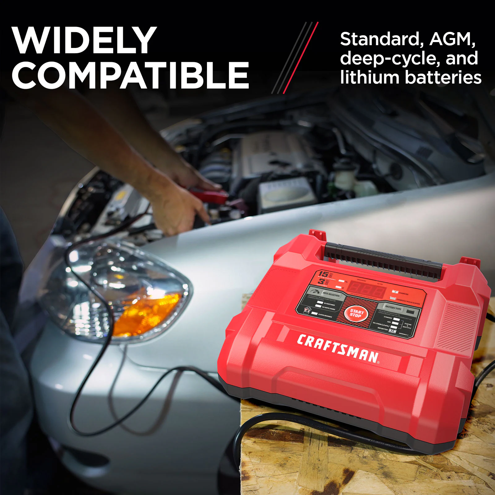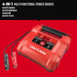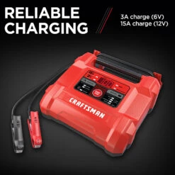 Every home garage should have an automotive battery charger and the Craftsman CMXCESM162 15A Automotive Battery Charger is a reliable choice. It is Compatible with a wide range of battery types, including standard, AGM, deep-cycle, and lithium (LiFEPO4) batteries. Fully automatic, this battery charger features auto-voltage detection and dependably delivers a 15A charge to 6V and 12V batteries. It also features a 3A maintainer mode to keep your battery charged and ready to go. The Craftsman 15A Automotive Battery Charger is microprocessor controlled and automatically selects the appropriate charge rate when charging or maintaining a battery. Fast, reliable, and easy to use, this Craftsman unit is perfect for your automotive battery charging and maintaining needs.