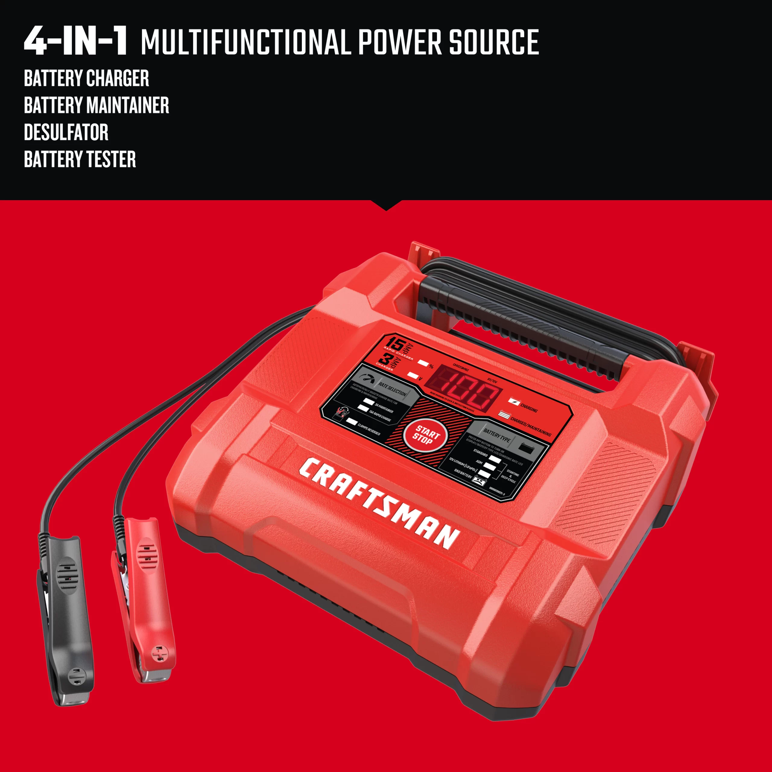 - 4-in-1 Device: Combines a powerful battery charger, battery maintainer, desulfator, and battery tester