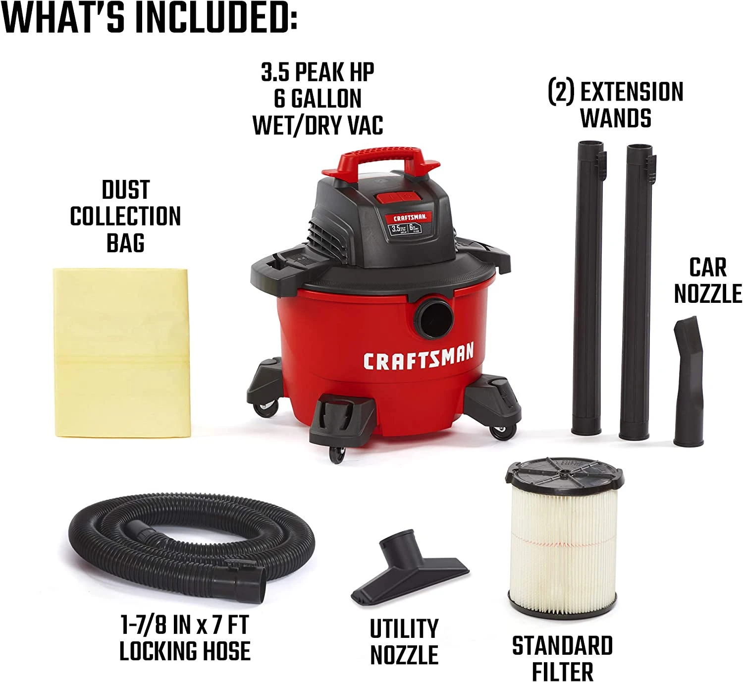 | Included Components | Wet/Dry Vac, 1-7/8 in. x 7 ft. POS-I-LOCK Hose, 2 Locking Extension Wands, Utility Nozzle, Car Nozzle, Qwik Lock Pleated Paper Filter, Dust Collection Bag |