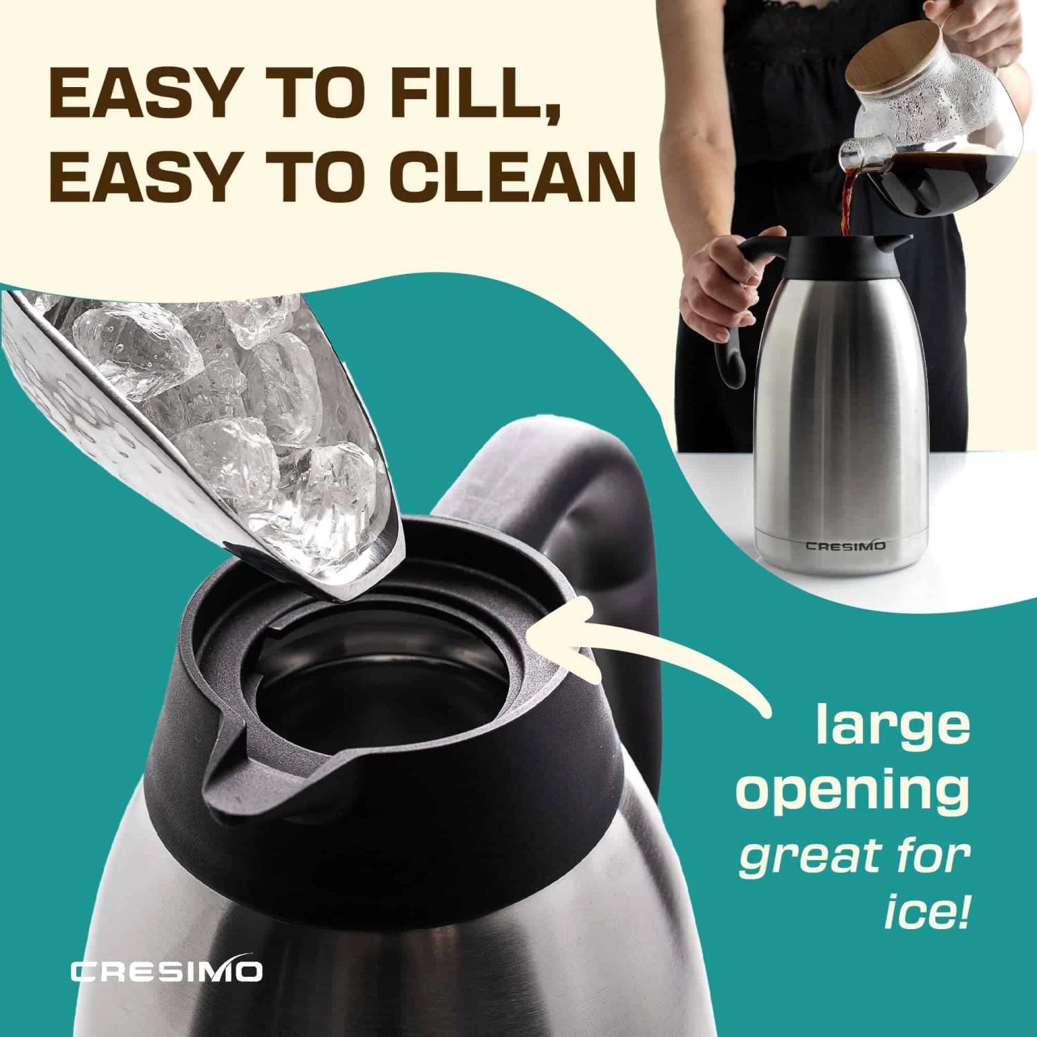 - EASY TO CLEAN COFFEE CARAFE INSULATED » Our carafe for hot beverages, including coffee, tea, and hot chocolate, is designed with a large mouth opening to make filling and cleaning a breeze making it an ideal hot cocoa dispenser for parties. Simply wipe the water dispensers inside with a sponge. The easy-detachable lid is leak proof and always locks into place when closing your coffee pitcher!