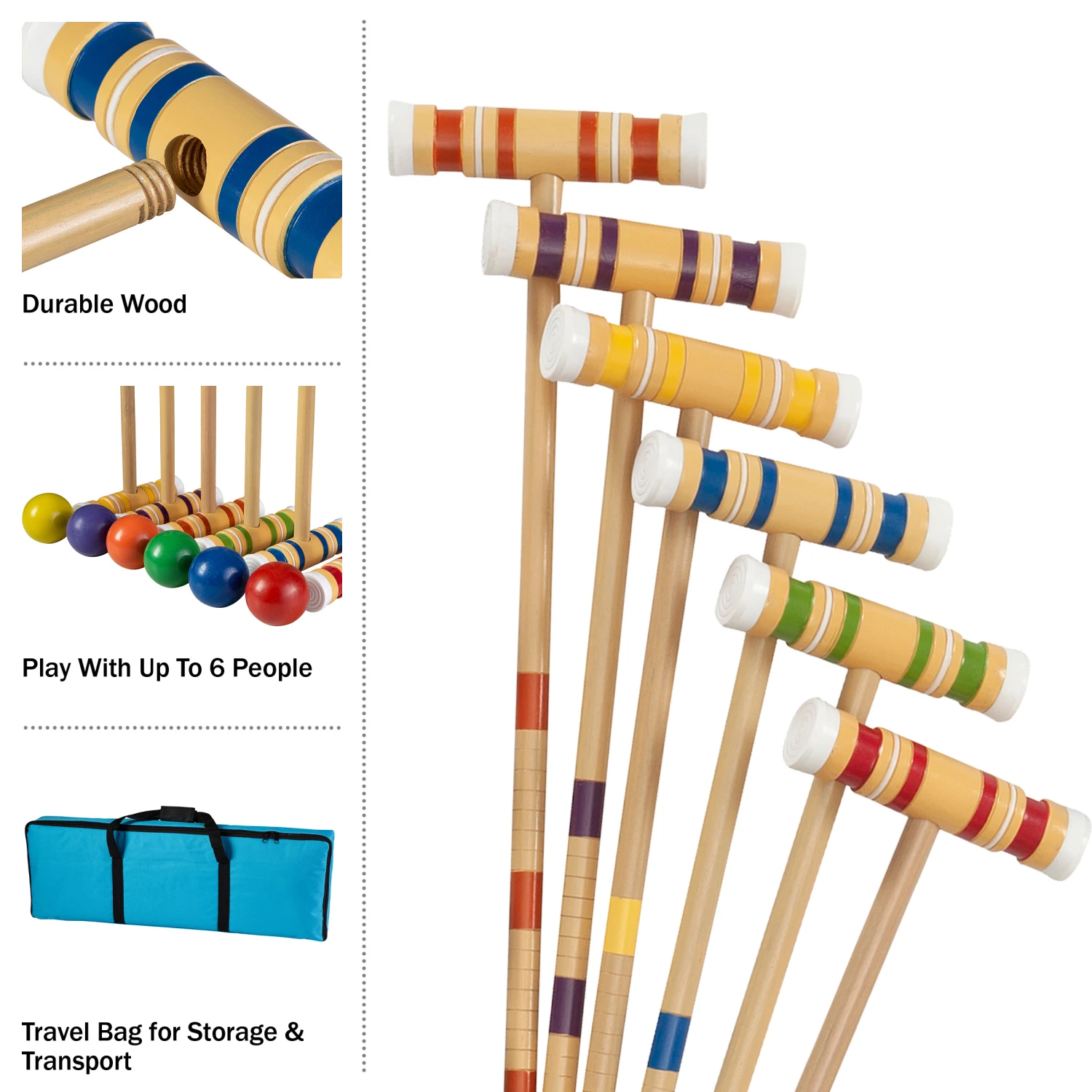 - PLAY WITH UP TO 6 PEOPLE: With 6 wood mallets, 6 balls, 2 posts, and 9 wickets, you can play this vintage croquet set with up to 6 people at a time.