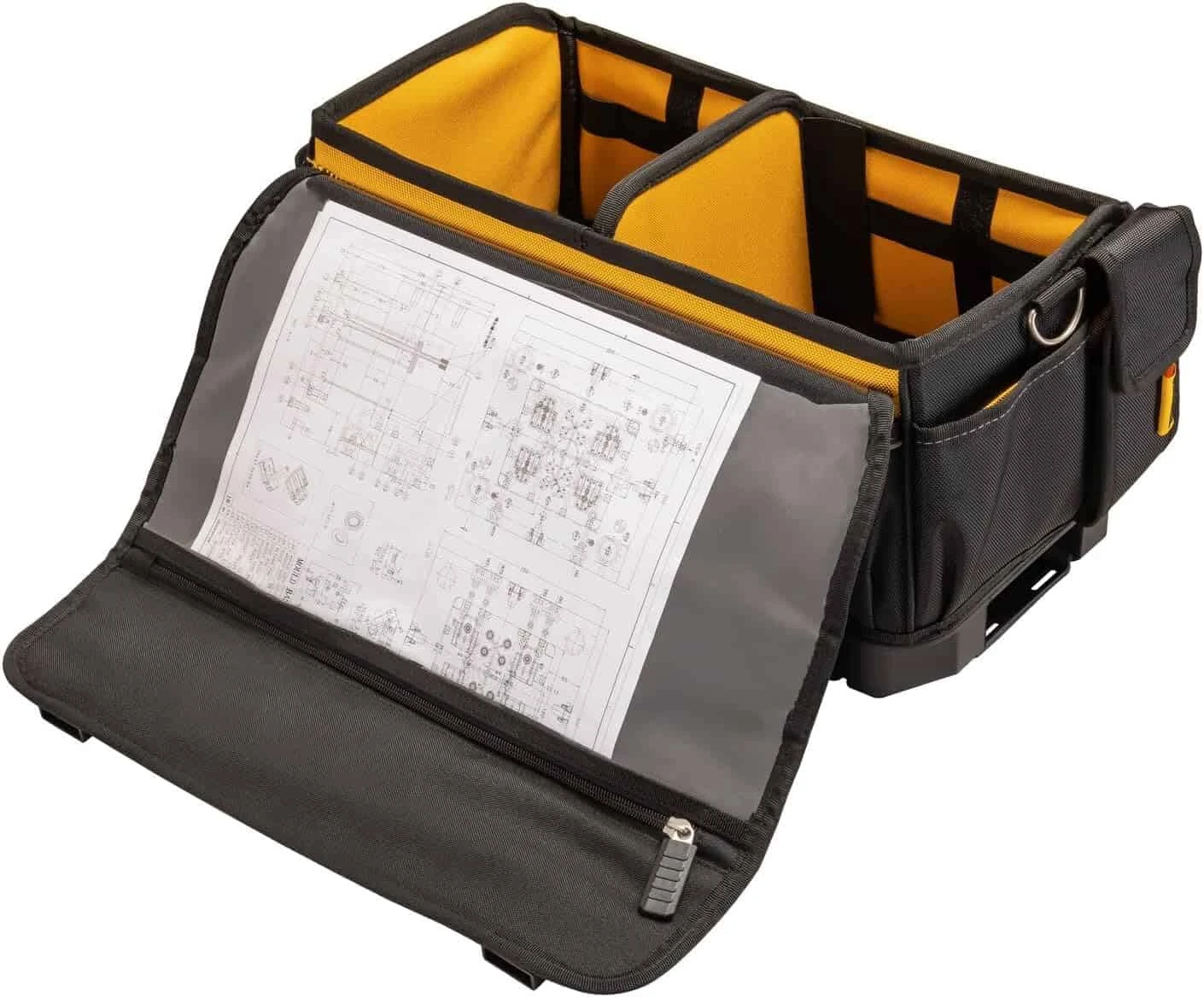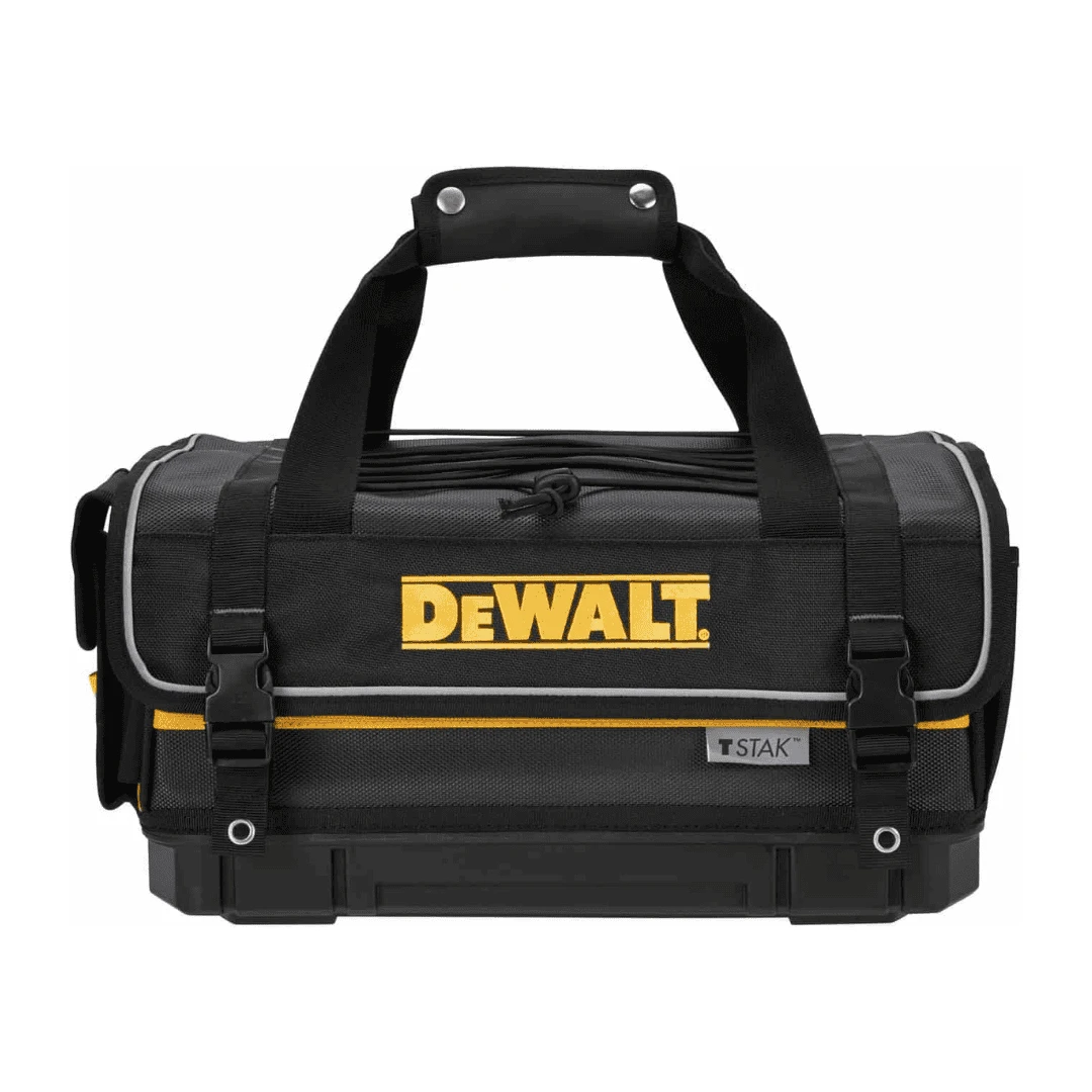 The TSTAKÂź Covered Tool Bag is a perfect addition to the TSTAKÂź family. It features a large space to place your tools, and a stain-resistant cover to protect your tools from the environment. The bag has pockets for dedicated storage, and features additional external storage on top when using the bungee cord on the cover. The bag can be carried by the padded shoulder strap, the carry handles, or can be stacked and carried on top of any TSTAKÂź modules. The TSTAKÂź Covered Tool Bag is also compatible with the DEWALT Large TOUGH CASEÂź organizer.