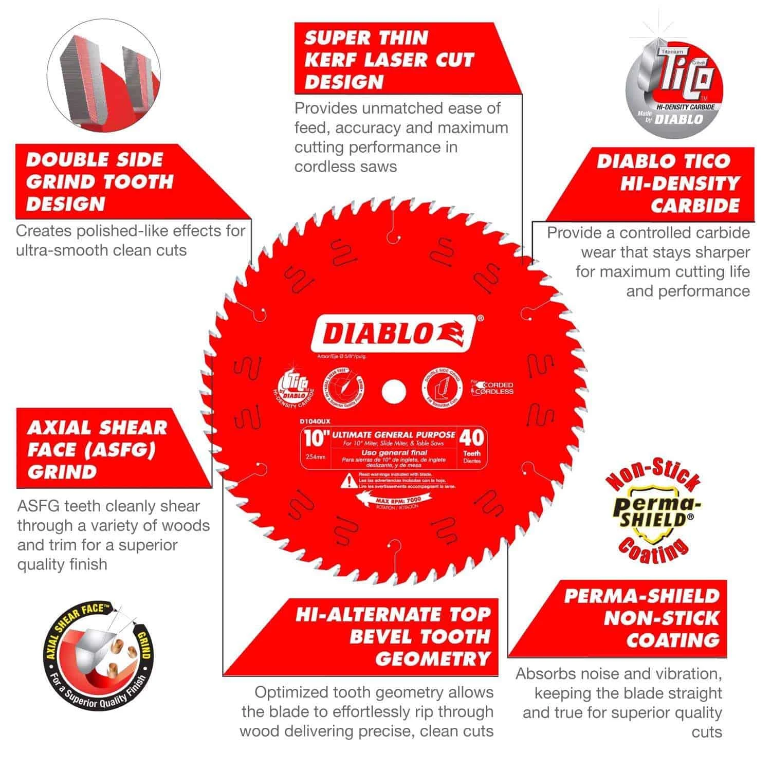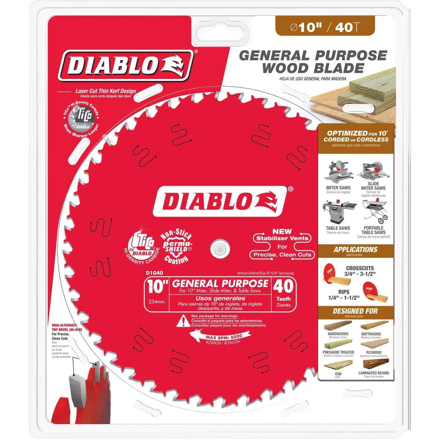 Diablo’s general purpose blade is ideal for cutting oak, pine, plywood, pressure treated lumber and beams. An excellent choice for table and miter saws, Diablo’s blade leaves a smooth cut in a variety of applications, reducing the need to change blades between tasks. Use it for rip cuts with a smoother finish than dedicated ripping blades or make quality crosscuts in solid wood or plywood. Great for chop and sliding style miter saws as well as table saws.