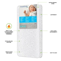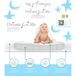 Dream On Me, 3 Spring Coil Mini/Portable Crib Mattress In White is of supreme comfort and quality for newborn, infant and toddler. You no longer need to purchase a standard size crib to get the comfort and support of a full-size mattress. This Portable/Mini crib mattress features interwoven steel coils that are wrapped in hypoallergenic, polyurethane foam and protected with a waterproof cover with Lock Stitch venting. The waterproof, hypoallergenic, antibacterial, cover aids in the prevention of mold, mildew and odor and easily clean with a cloth with warm water and mild soap. This mattress passes the Federal Standard Flammability Standard 16 CFR 1633. Designed to fit a standard 24” x 38” Portable/Mini Crib.