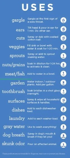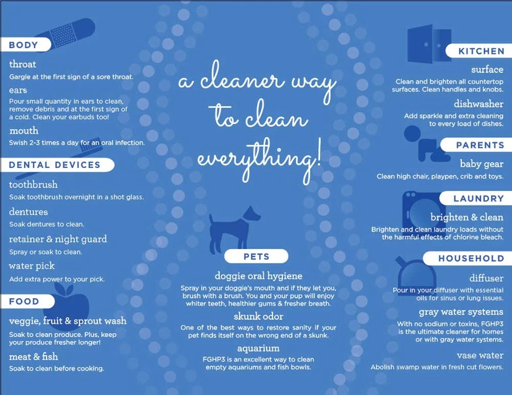 - IT WORKS. The ultimate cleaner for 1st AID cuts and scrapes; BODY ears, throat and diffusers; HOUSEHOLD counters, surfaces, cutting boards, laundry, stains, toothbrush and baby gear; FOOD nuts, seeds, grains, veggies, fruit, meat, fish and chicken; PETS oral care and skunk odor; and PLANTS vase water and sprouts.