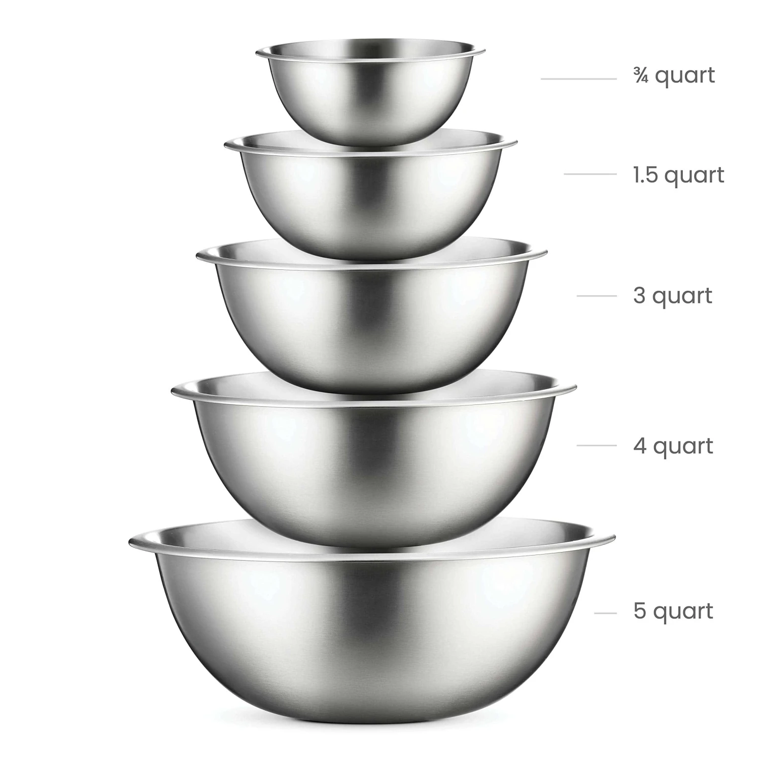- SIZED FOR EVERY TASK – With A range of 5 Sizes—¾, 1.5, 3, 4, and 5 quart—metal mixing bowls add versatility and functionality to your kitchen. For all-purpose kitchen workhorses from prepping, mixing, stirring, to kneading dough like a pro