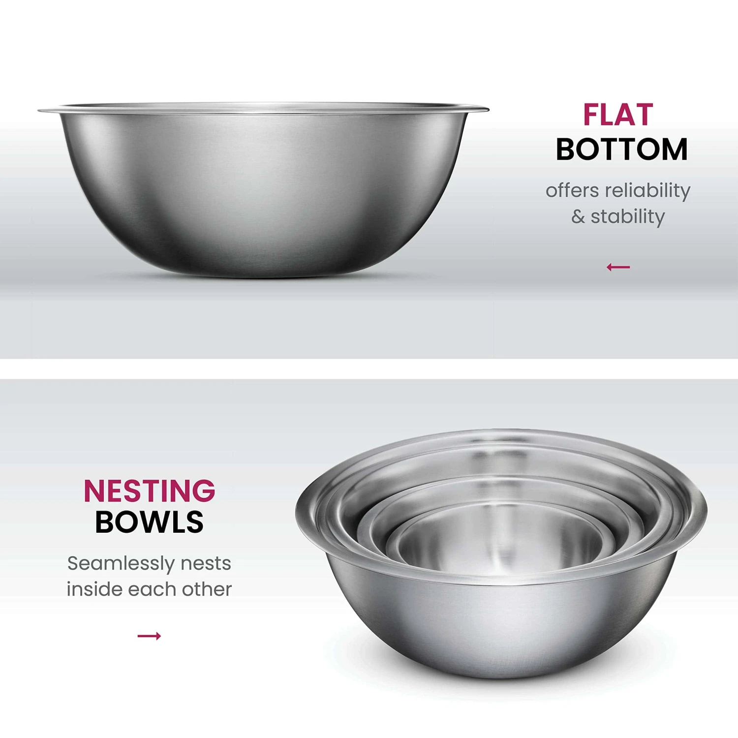 The lightweight stainless-steel bowls—ideal for everyday tasks—are made from freezer- and dishwasher-safe, durable, shatterproof materials to last a lifetime. The wide rolled rims allow for drip-free pouring and a solid grip. Flat bases provide balance and stability for tossing salads, whipping creams etc. Capacity marked outside bowls for easy identification.