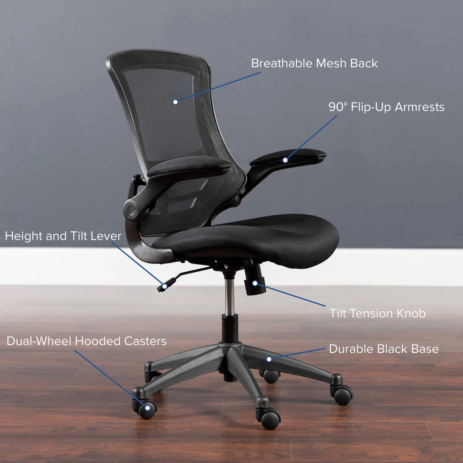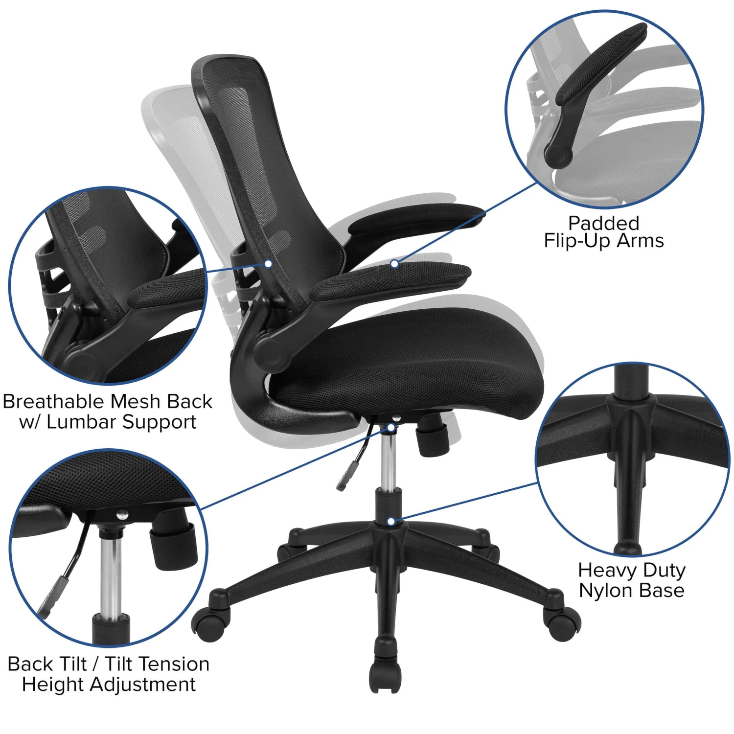 - Flash Furniture Kelista Mid-Back Black Mesh Swivel Ergonomic Task Office Chair with Flip-Up Arms, BIFMA Certified