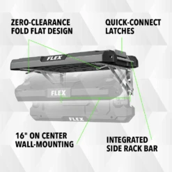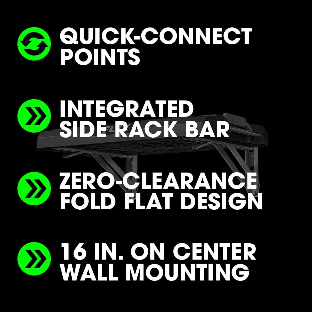 Organize your garage, trailer, or workshop with wall-mounted folding storage solutions in the STACK PACK Folding Rack Shelf. The rack shelf features a zero-clearance design that folds flat and closes flush to save space. Its 16-on-center design mounts on walls with standard 16-inch stud spacing without the guesswork. The shelf has a 70-pound load capacity for tools, materials, and accessories. An integrated side rack bar allows you to hang power tools and other items from the sides of your rack shelf for additional storage or easy access when needed. Quick-connect latches offer fast and effortless interlocking connectivity so you can securely mount and quickly disconnect STACK PACK toolboxes from the shelf.