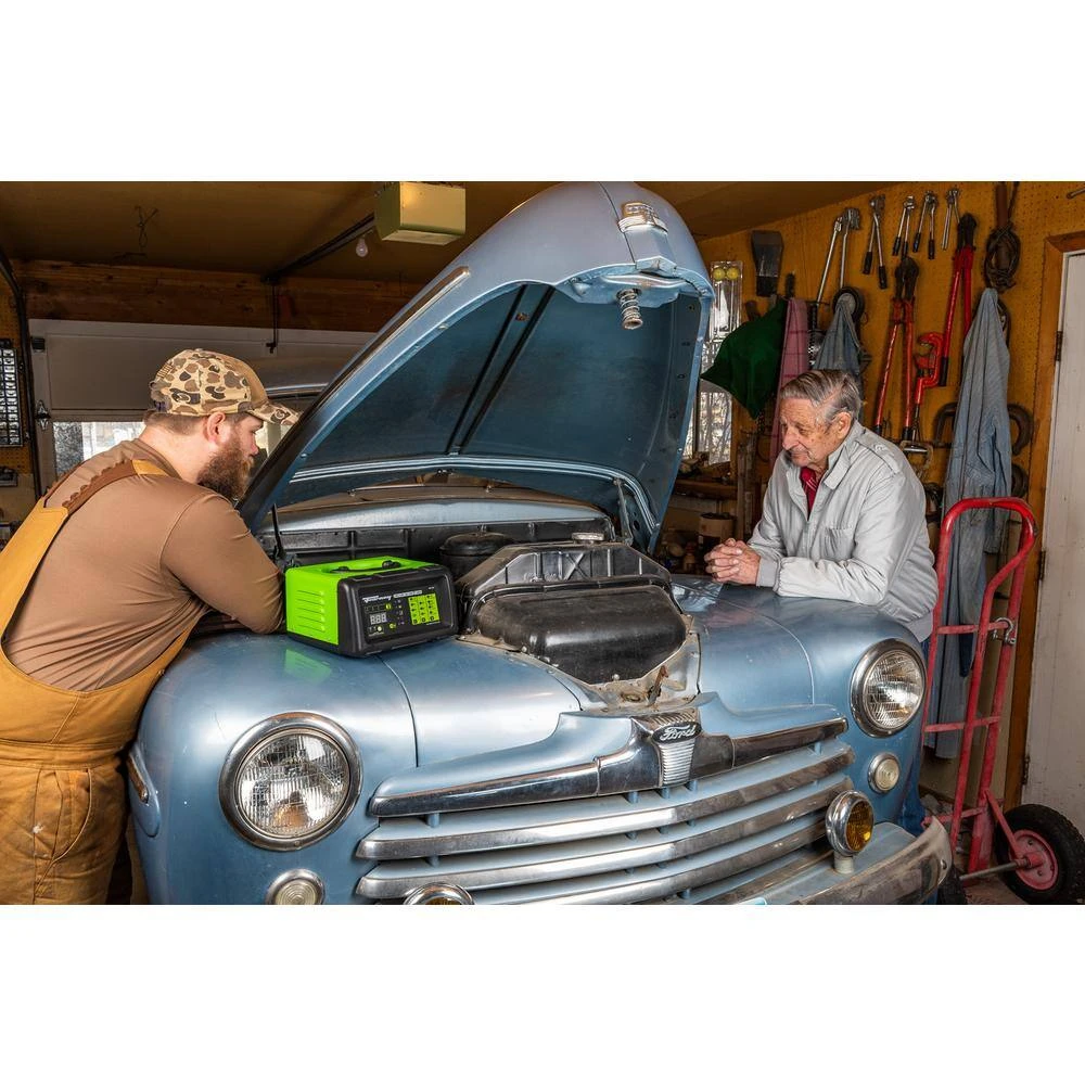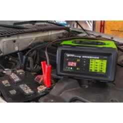 This Forney battery/trickle charger is also commonly referred to as a bench charger. Features LED indicators and button controls for easy reading and accuracy. It can charge both a 6-Volt and/or a 12-Volt battery at 2 Amp (trickle), 10 Amp (standard) and 20 Amp (quick charge). At 12-Volt, this bench charger also has a 100 Amp Engine Start charging capability. Using the 100 Amp emergency start setting is powerful enough to bring cars, SUVs and small trucks back to life. It is ETL certified. The recessed control panel protects against accidental setting changes. Features LED indicators and button controls for easy reading and accuracy. This charger is spark proof. It is suitable for Absorbed Glass Mat (AGM), GEL and standard (STD) batteries. It has an automatic charge cycle functionality switches to float mode after fully charging the battery . Short circuit, overheat and reverse polarity protection will not operate if clamps are reversed. The charger will enter repair mode if a rapid drop in voltage is detected. An error notification will light up if a bad connection is detected. A 13.6-Volt power supply mode provides DC power supply for powering any 12-Volt device (e.g., a tire inflator) or as a memory retainer when replacing a battery. The active charging indicator cycles between volts, amps and battery percent. The auto amperage detection feature detects best amperage based on battery condition. Wrap cleats provide convenient cord storage.