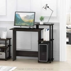 - Fits in your space, fits on your budget. Features CPU storage shelf, elevated shelf for a compact printer, or other stationery decor.