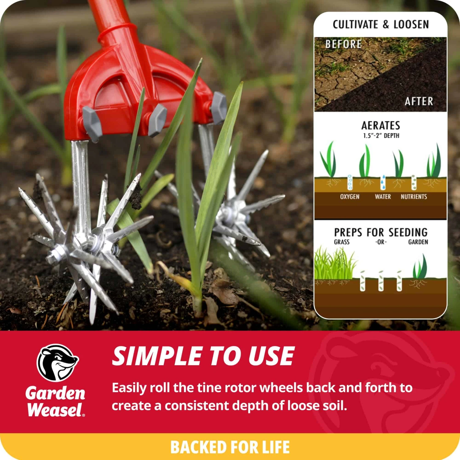 - THE KEY TO HEALTHY SOIL: Aerate, prepare and maintain large or small areas of soil for planting, reseeding grass, or preventing weed growth. It’s twice as fast as hand held cultivators, requires half the effort, and puts less strain on your back.