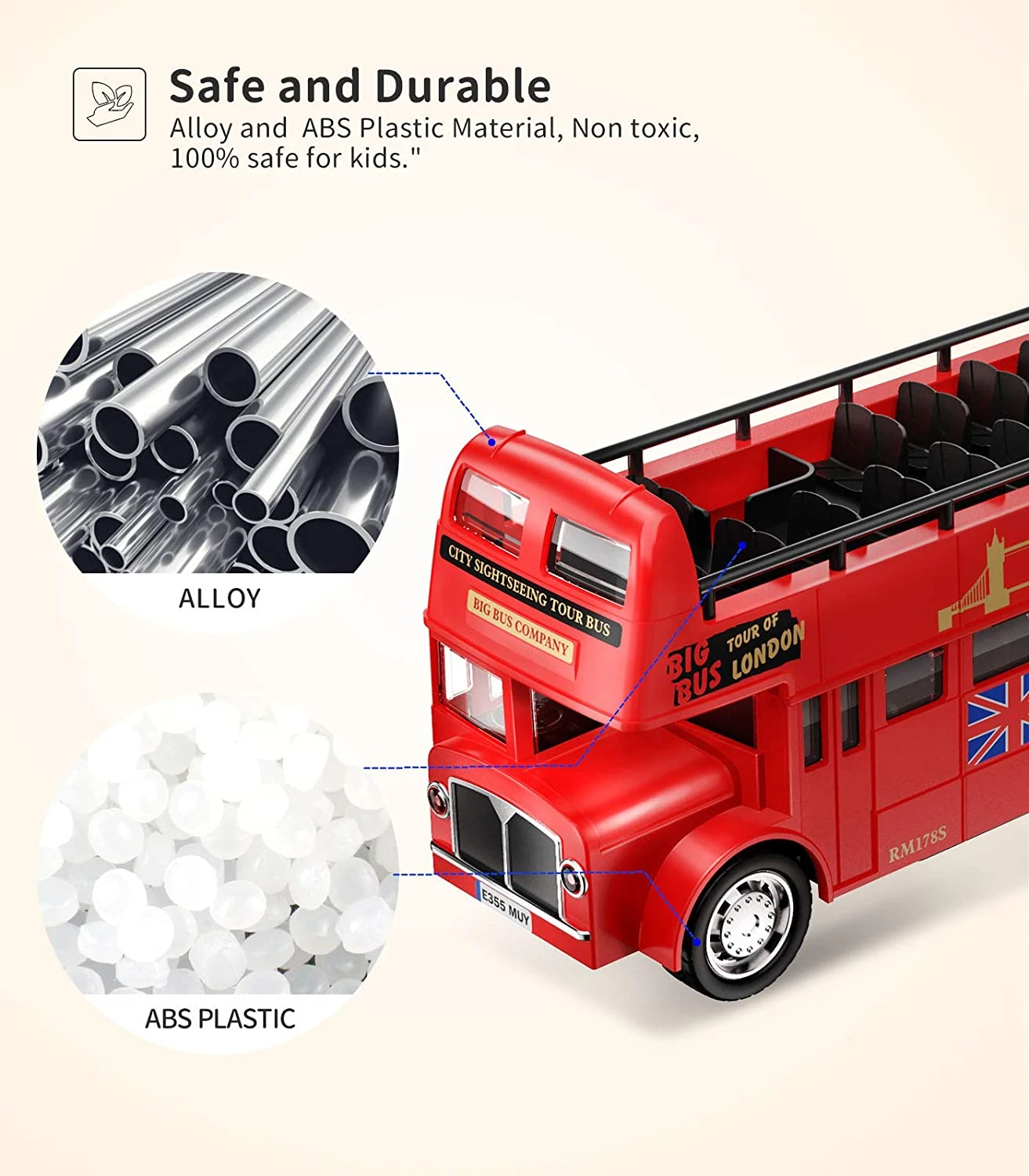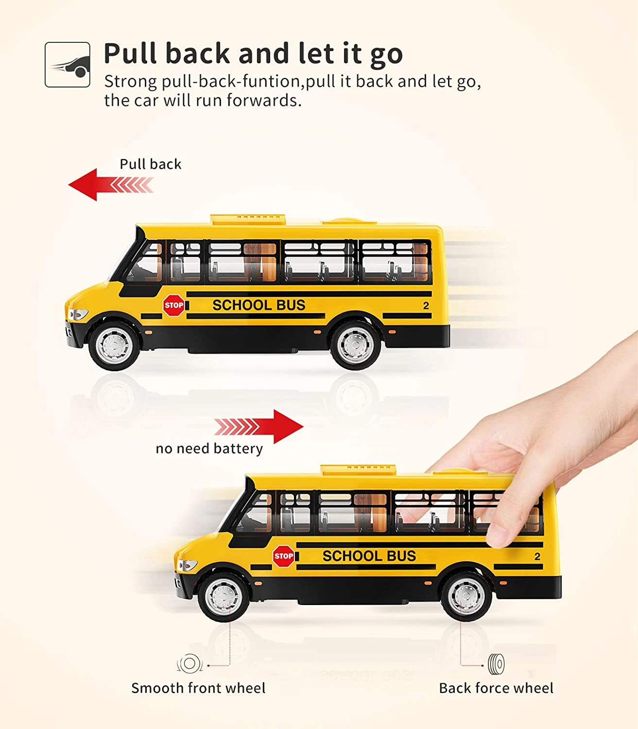 - Realistic Looking: Every Kids bus Toy comes with realistic looking, authentic decorations. No need Battery . All vehicles are Pullback action! Rolling it backwards on the rear wheels to make it go on its own. Lets your child take control of the vehicle and their Imagination!