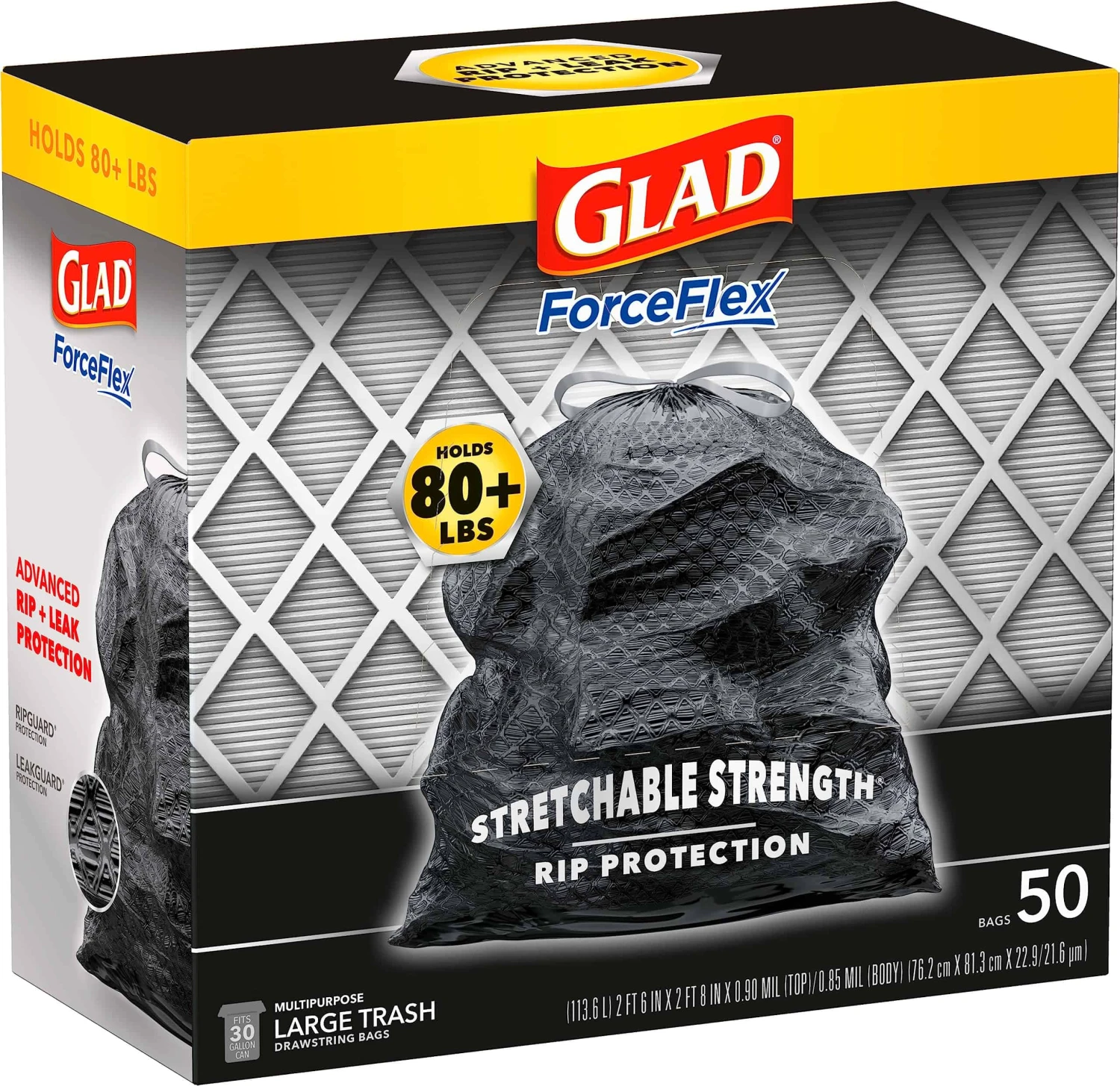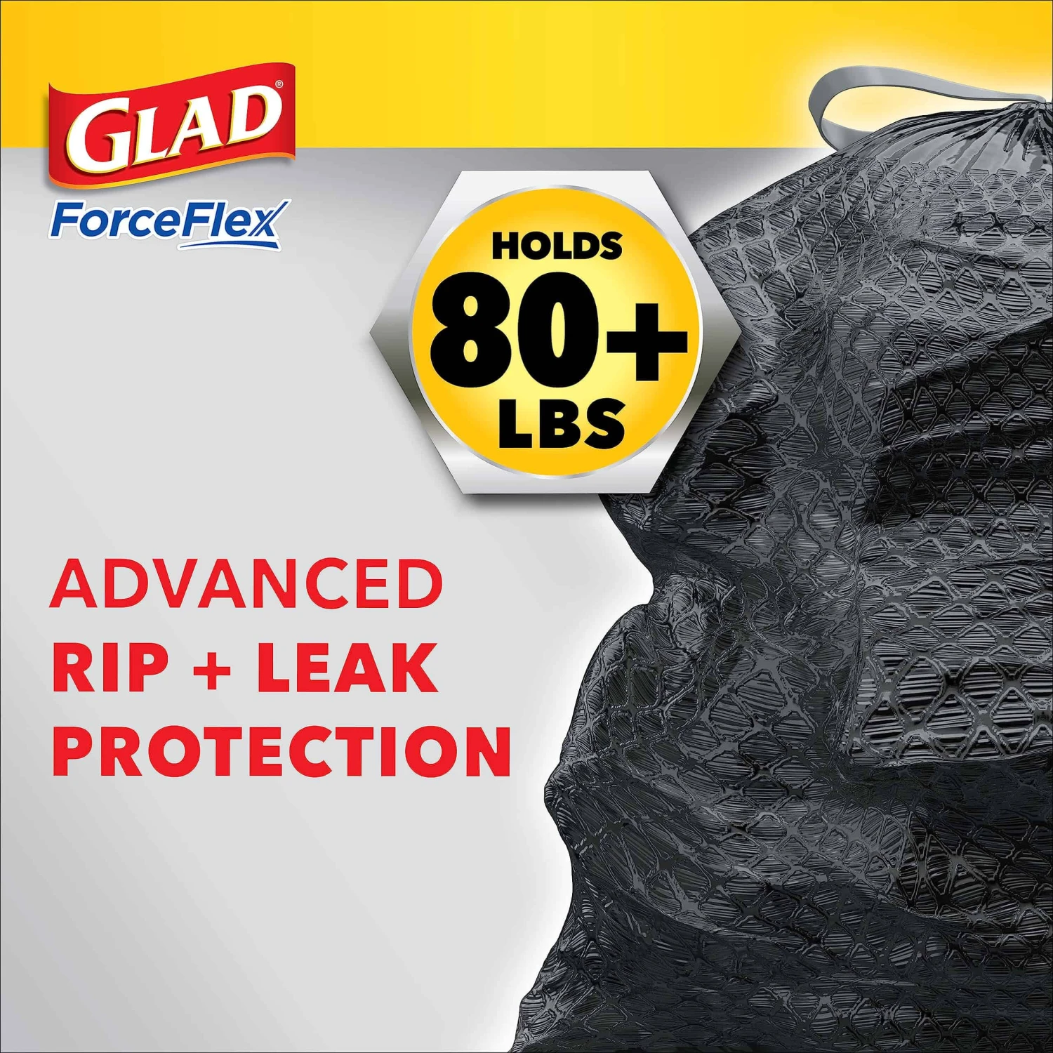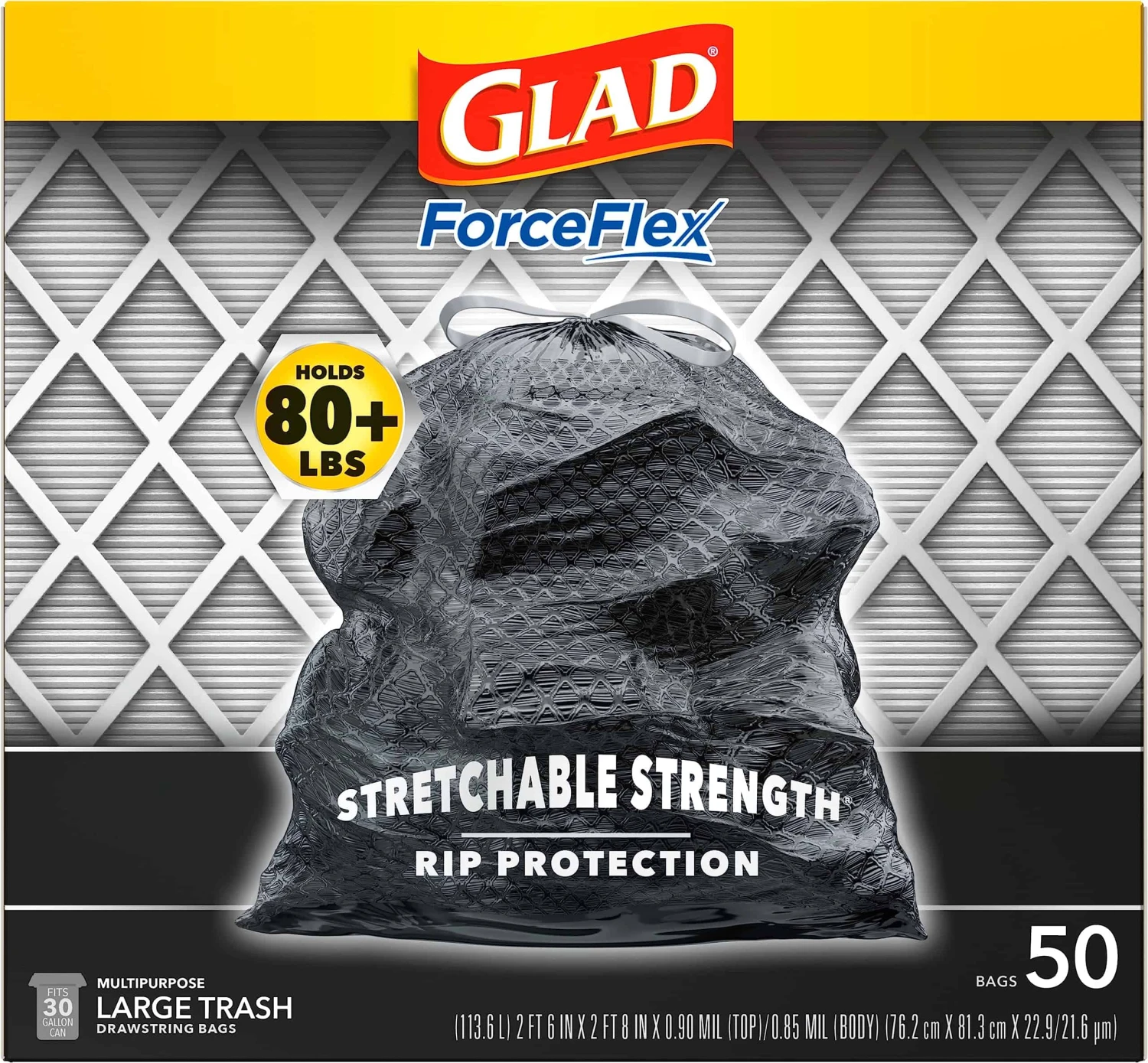 Keep your trash contained with the durability and quality of Glad. Glad Large Trash bags are made with ForceFlex technology and Stretchable Strength Rip Protection to give extra flex and expand around sharp edges without ripping, so you can pack in over 80 pounds of your heaviest trash. Designed with stretchable strength, these dual-layered trash bags feature RipGuard and LeakGuard technology to resist punctures, rips and tears, and leaks. Trust Glad to handle all your biggest trash messes inside and outside your home. The durable Grips-The-Can Drawstring ensures that the bag stays in place and provides a sturdy handle to make it easy to lift, carry and toss when its time to take out your trash bag. Trusted Glad strength helps you avoid messy trash disasters with a unique design that allows the bag to stretch at top while reinforced bands through middle contain bulky trash. Take on the trash and all your tough jobs with the confidence of Glad.