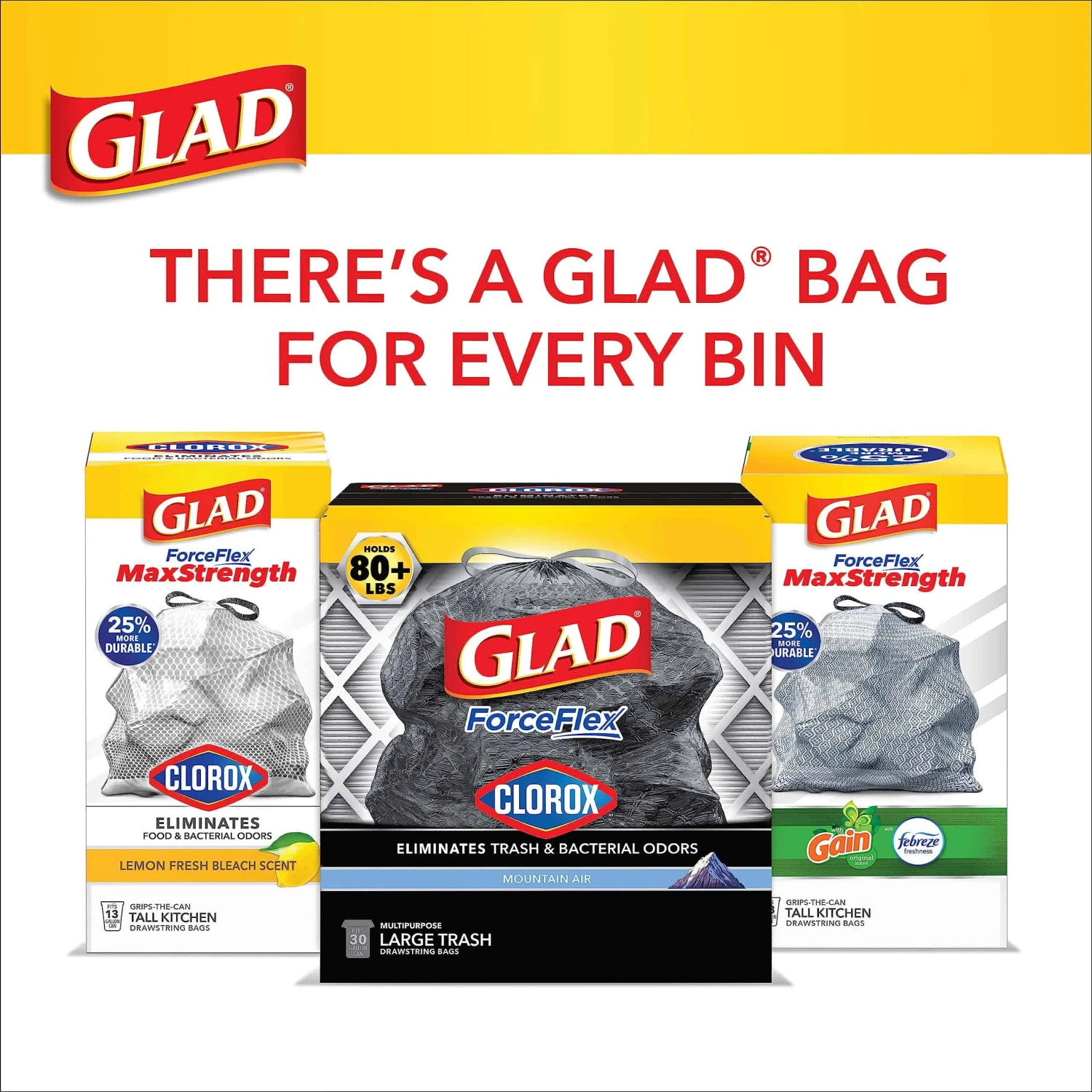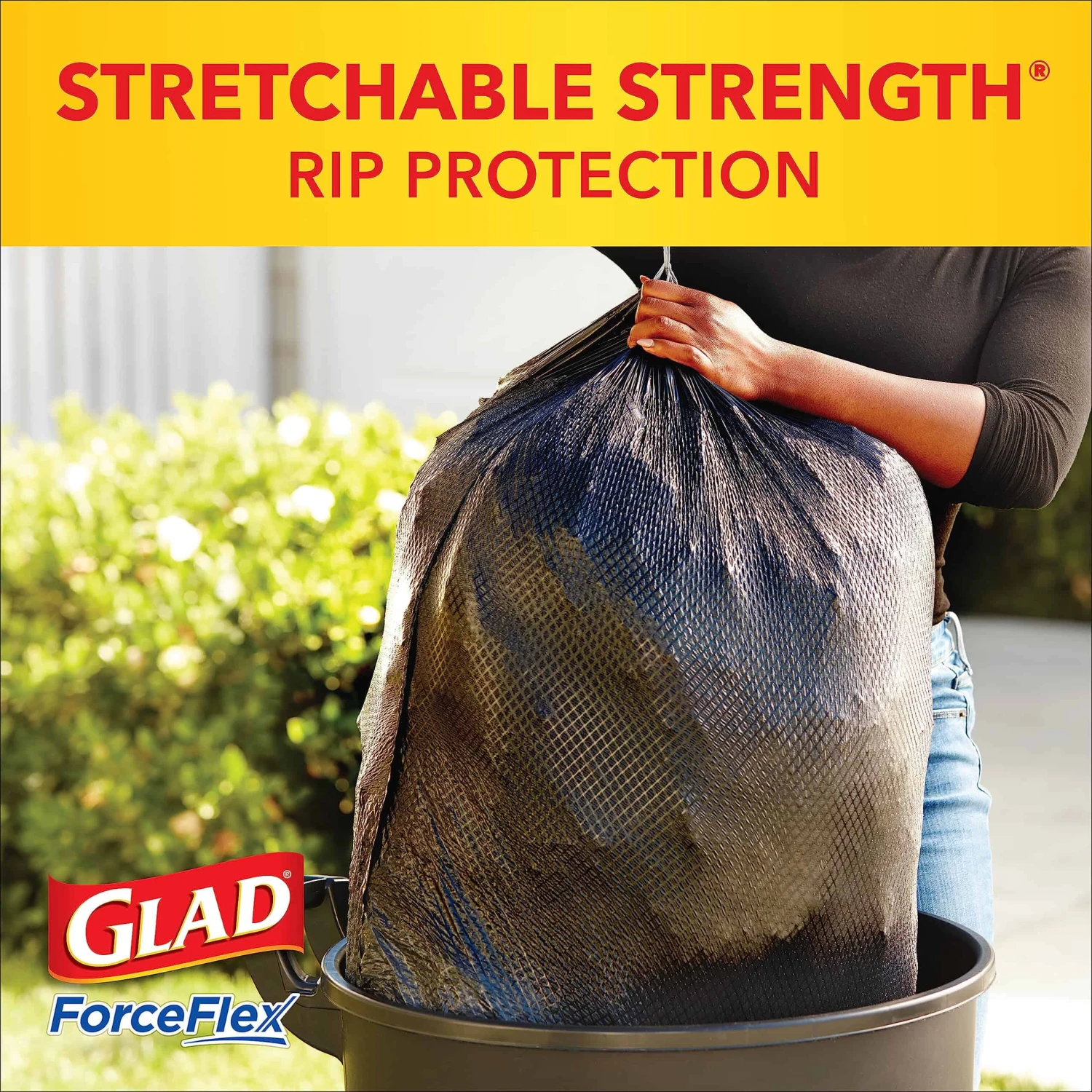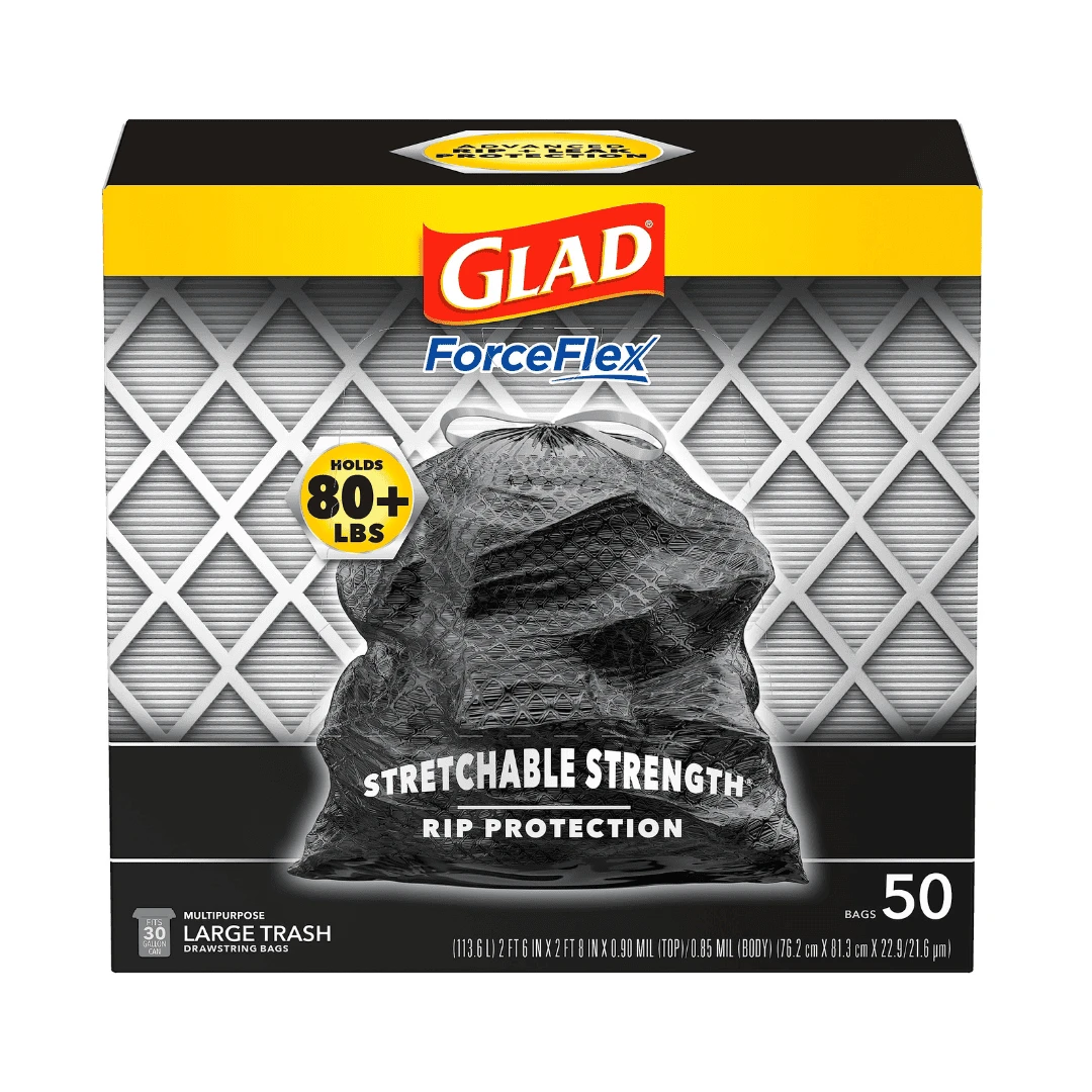 - FORCEFLEX TRASH BAGS: Glad’s trusted ForceFlex technology allows the garbage bag to stretch and expand over heavy loads with sharp edges, delivering durable strength; packaging may vary